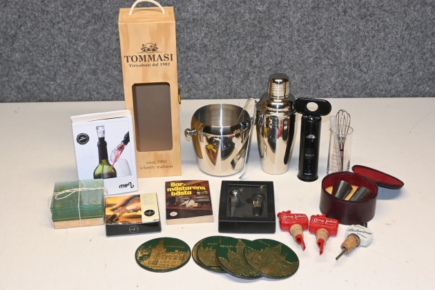 Parti bartillbehör bl a schacker, ishink, mätglas, underlägg, retro droppkorkar