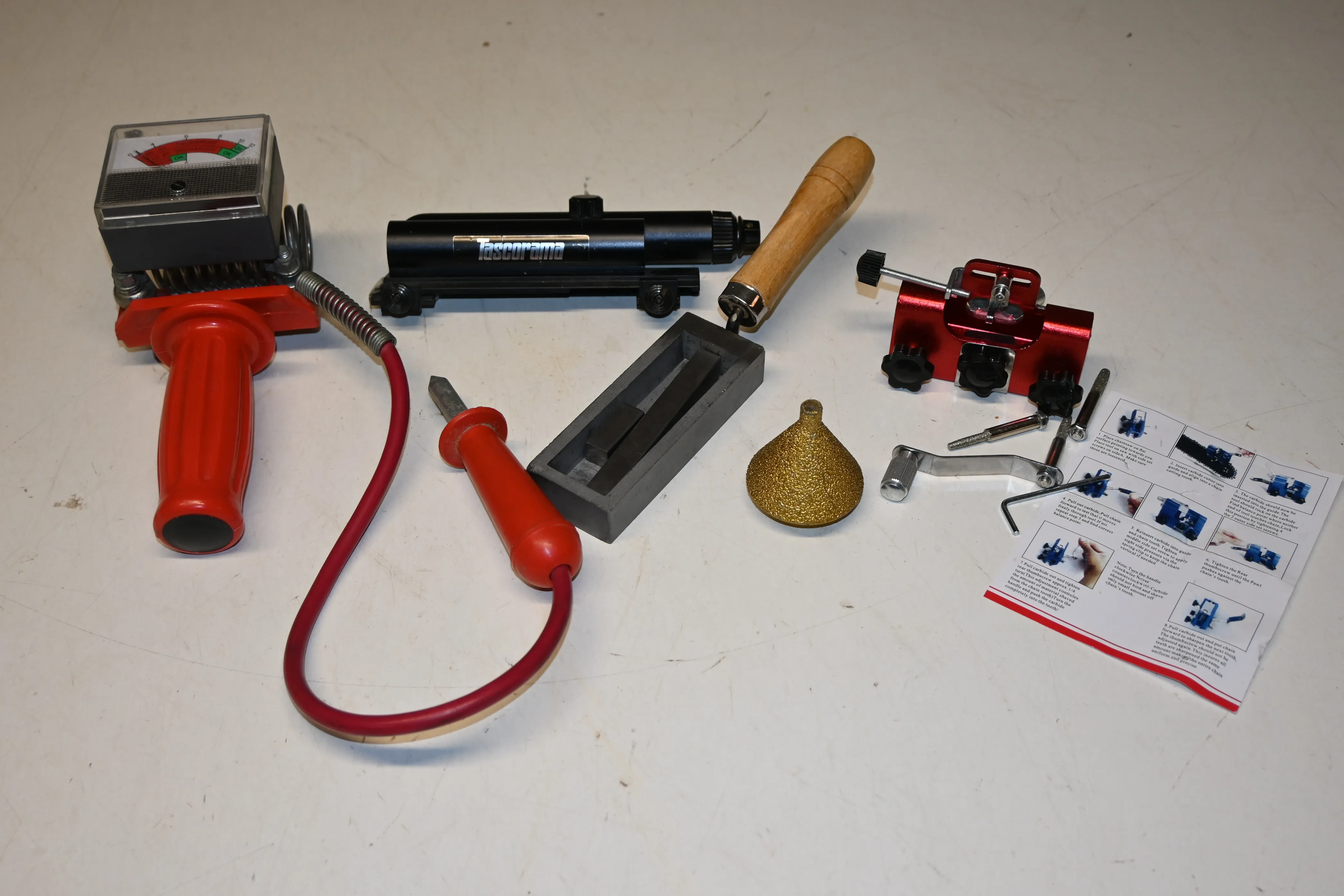 Parti batteritestare, kedjeslip till såg, gjutform för metaller, Tascorama rödpunktssikte (ej testad), diamantfasningsverktyg 50mm M14