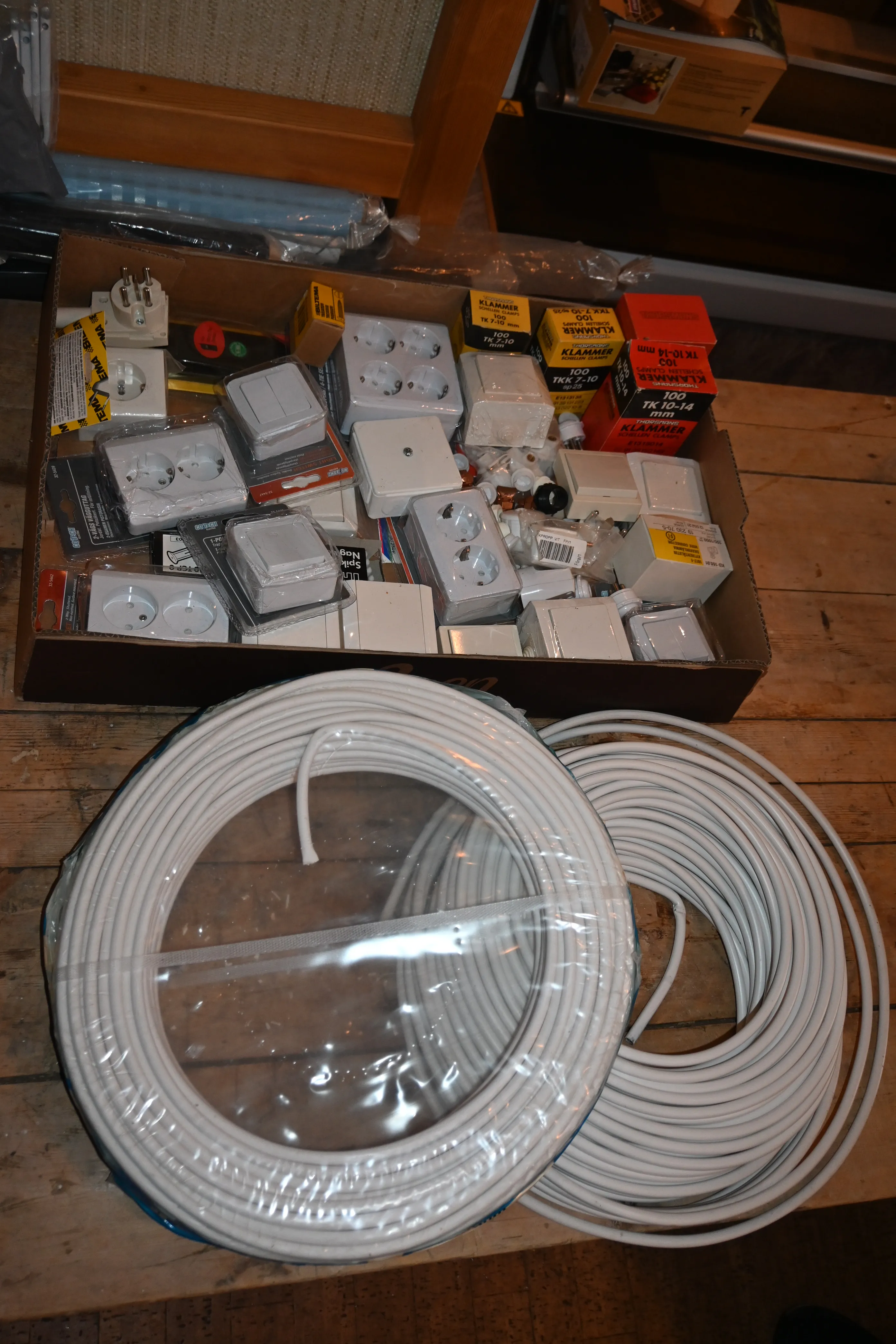 379. Parti bl a elkablar 2x1.5 ca 100m, elkontakter, klämmor (oanvänt)