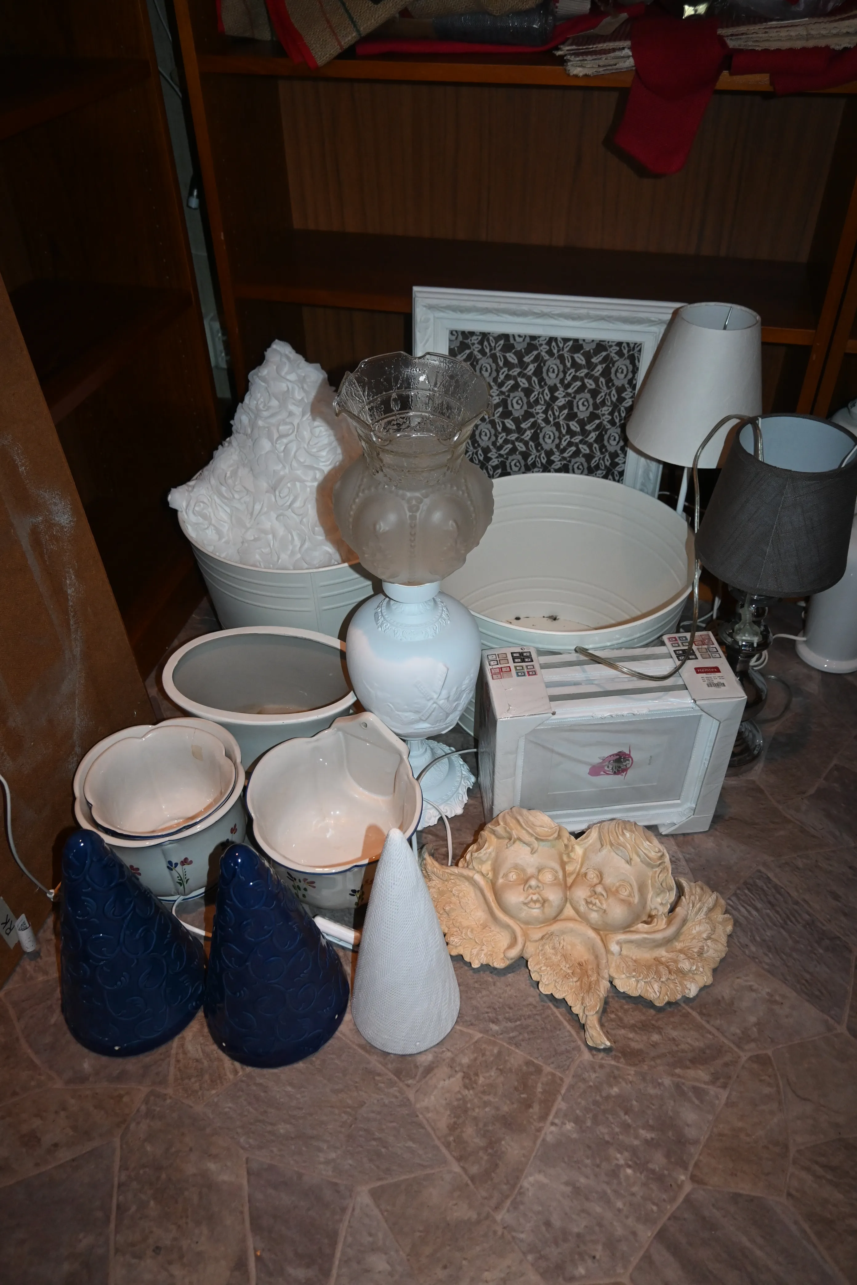 Parti bordslampor, blomkrukor, fotoramar m.m (skadad kupa)