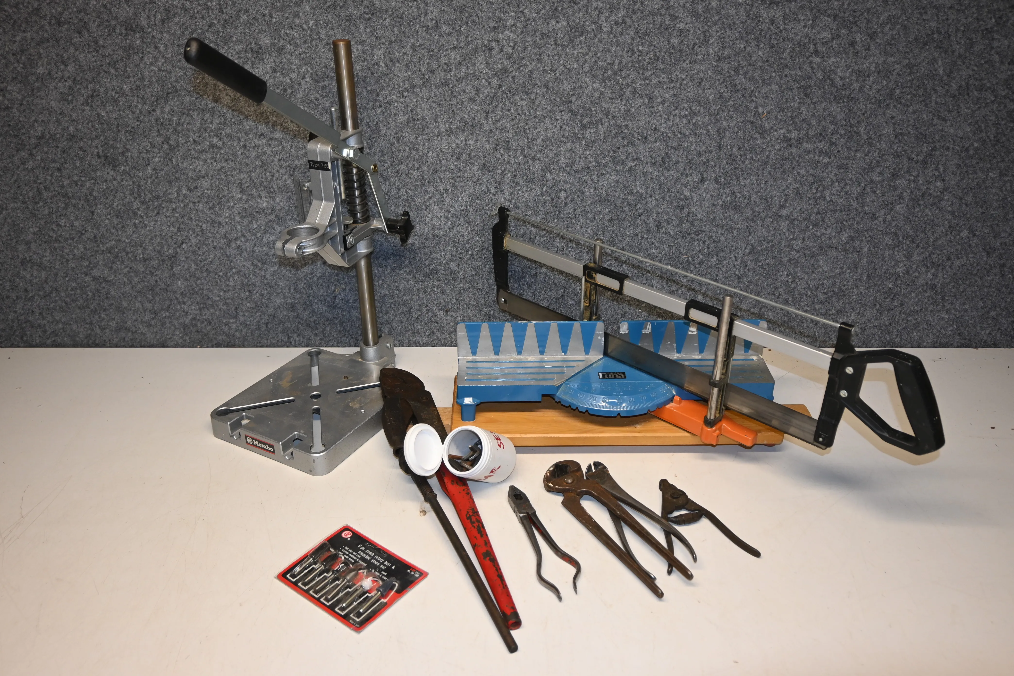 Parti borrstativ, gersåg, rörtång + div verktyg