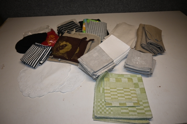 150. Parti bröddukar, servetter, förkläden, grytlappar (oanvända)