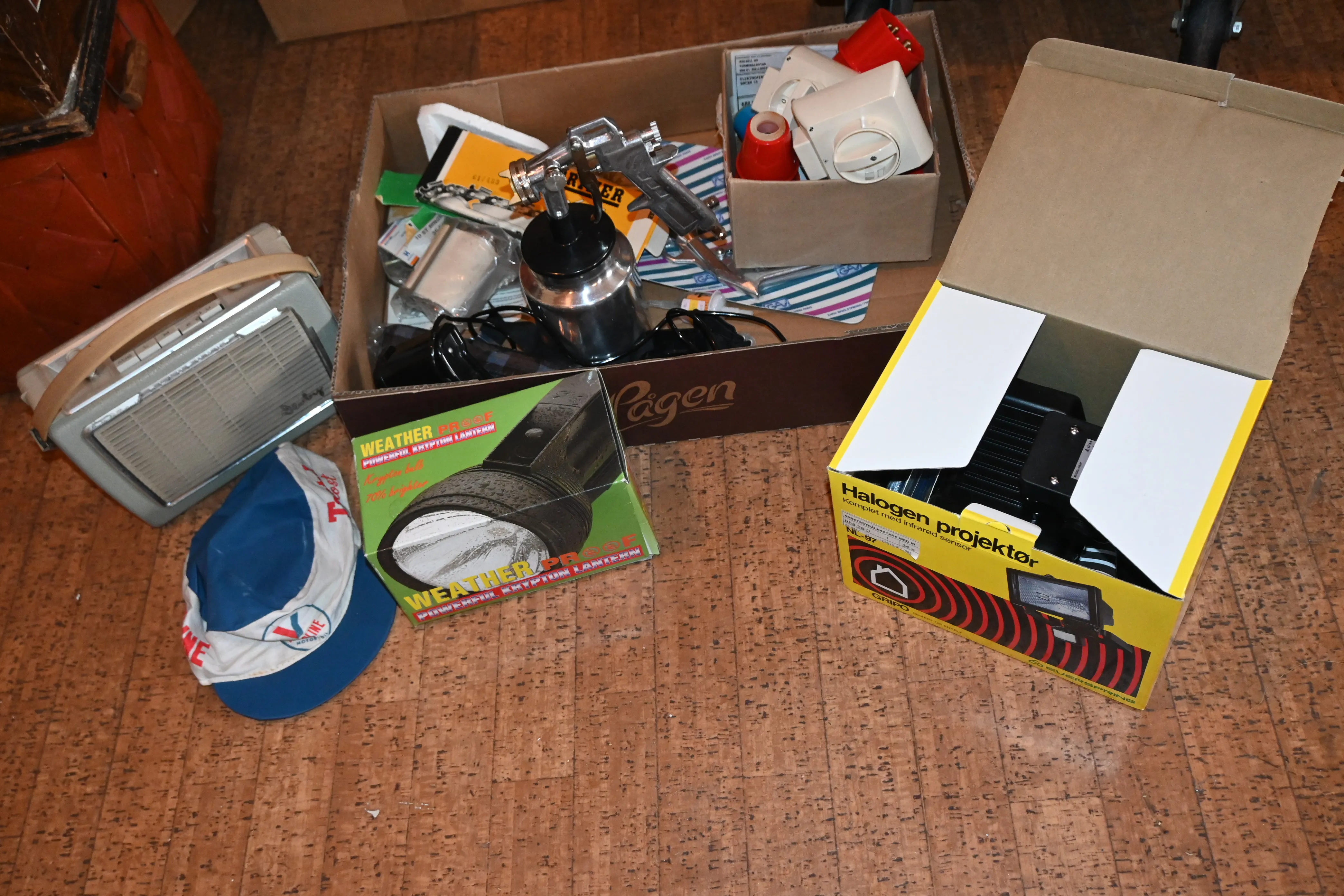 Parti bygglampa, ficklampor, radio, färgspruta (mestadels oanvänt)