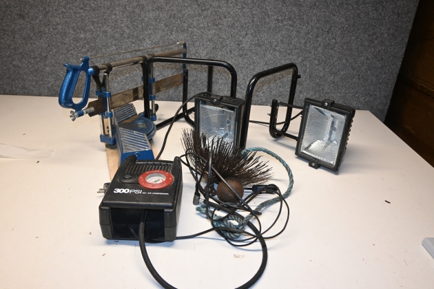 449. Parti bygglampor, gersåg, sotviska, kompressor