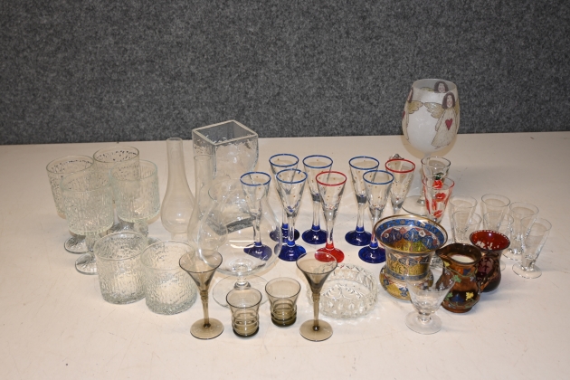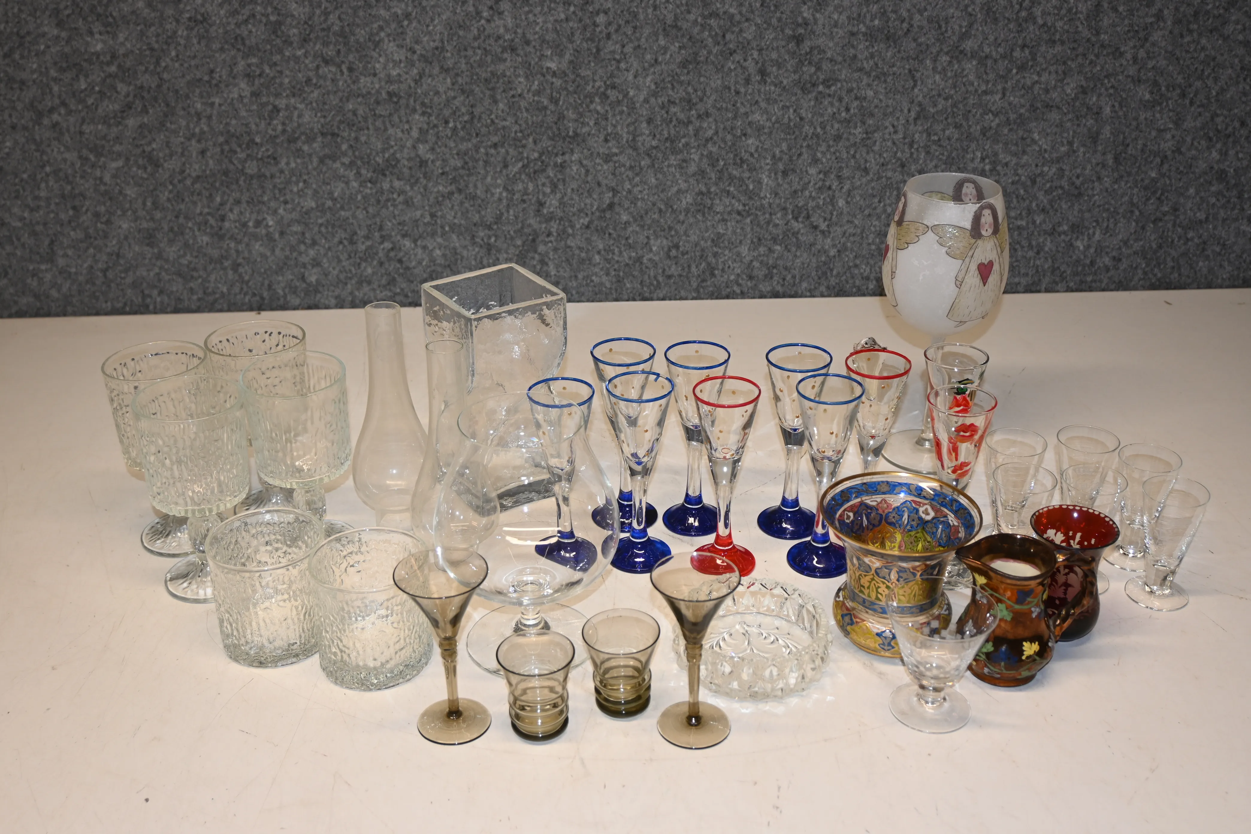 Parti div glas bl a handmålade snapsglas, linjeglas (ngt nagg kan förekomma)