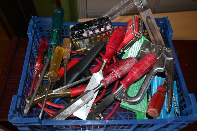 544. Parti div verktyg, huggmejslar, stifrapparat, skruvmejslar, skjutmått
