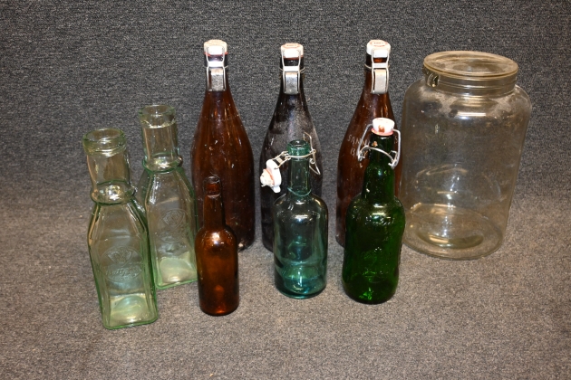 Parti dryckeskrus, flaskor, förvaringsburk i glas