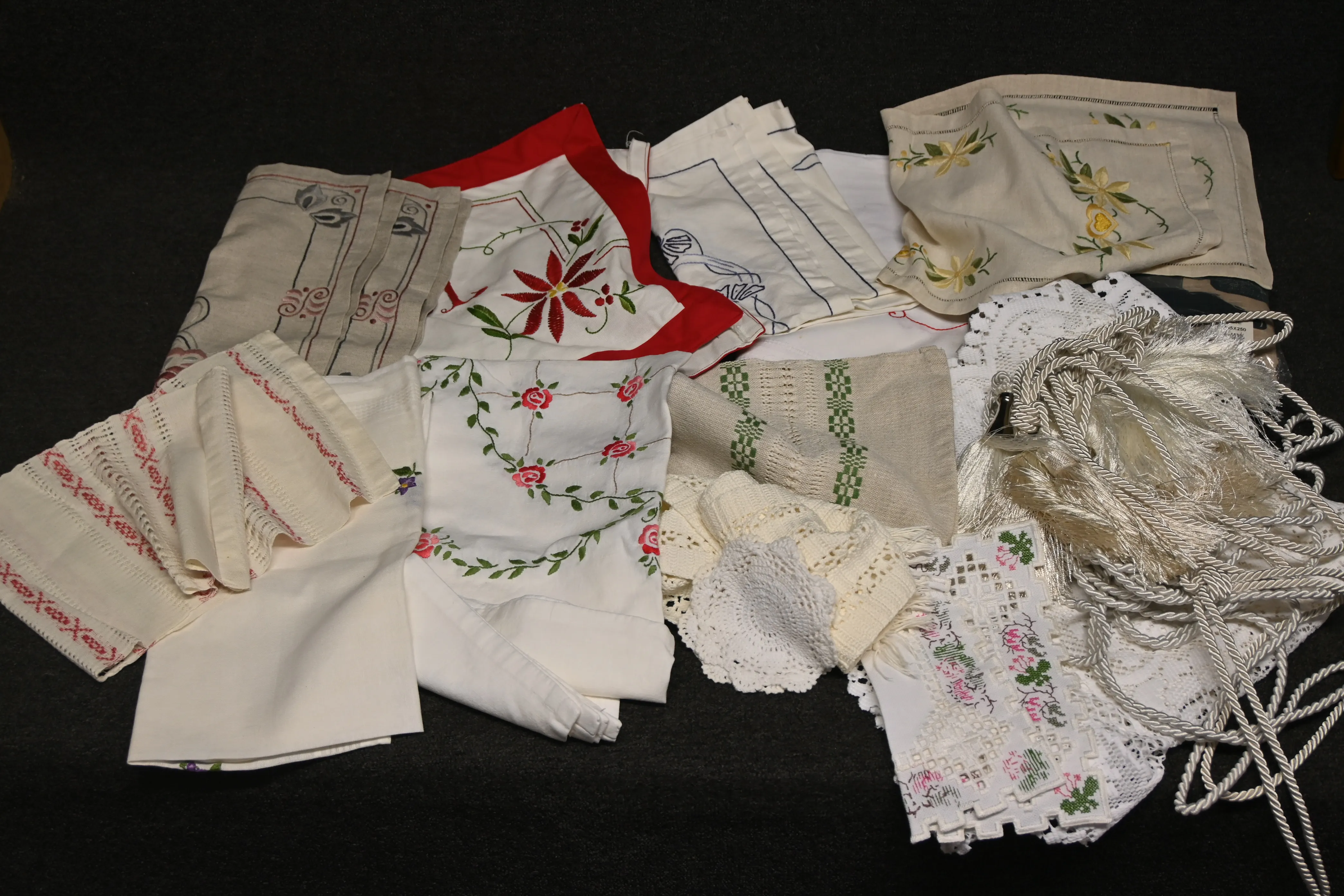 Parti dukar bl a hemvävda löpare, broderat, gardiner oanvända