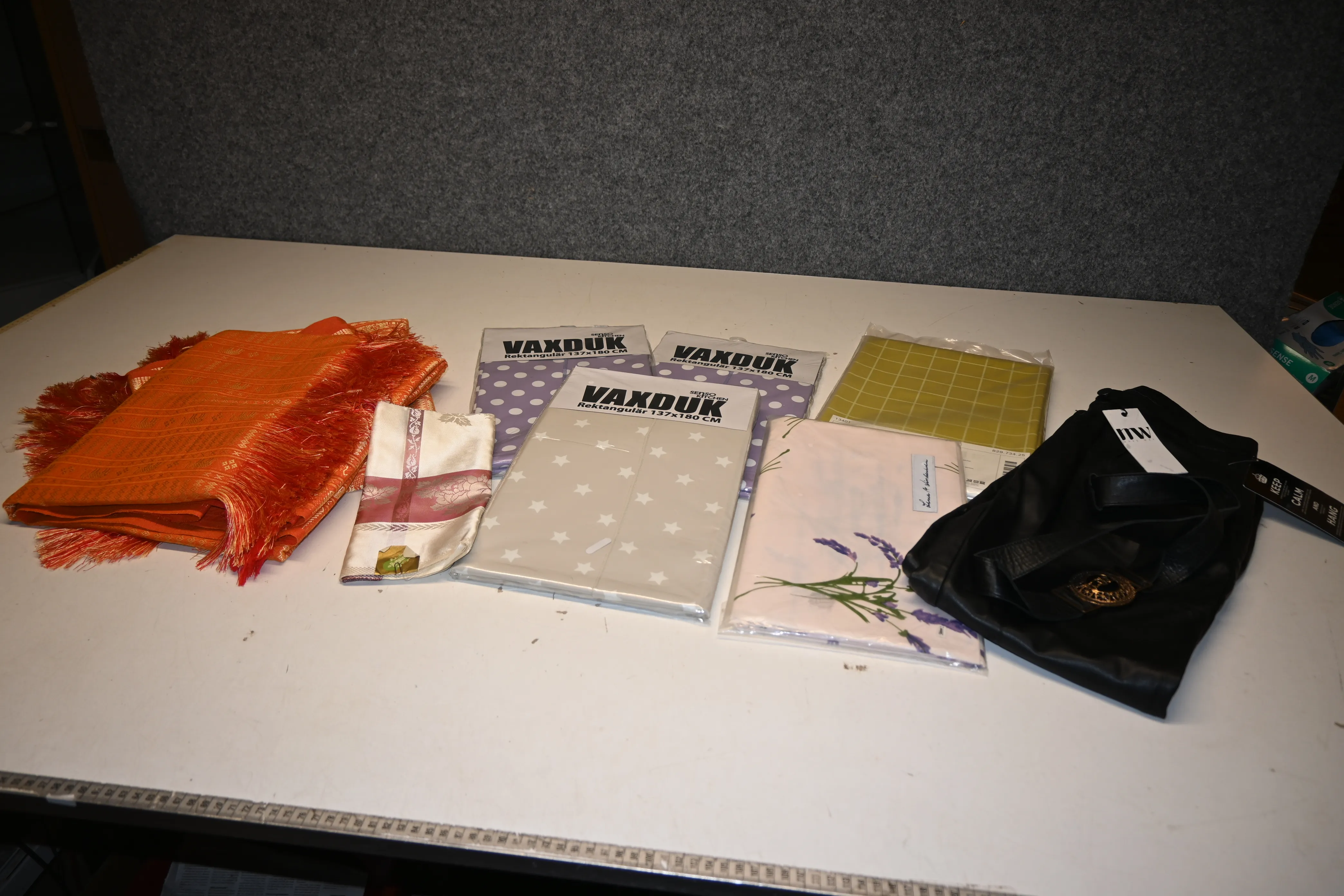 Parti dukar, duschdrapari, vaxdukar, byxor i konstskinn strl s