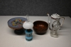 414. Parti fat på fot, skål i trä 1900.tala, tillbringare, fotogenlampa, kluckflaska