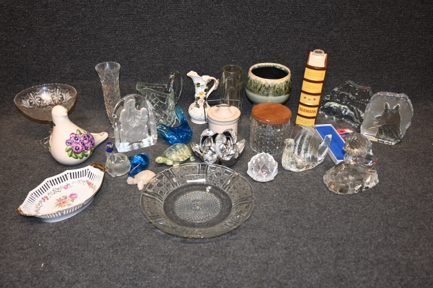 Parti figuriner i glas bl a Pukeberg, glasblock, vaser, tillbringare, gallerfat m.m