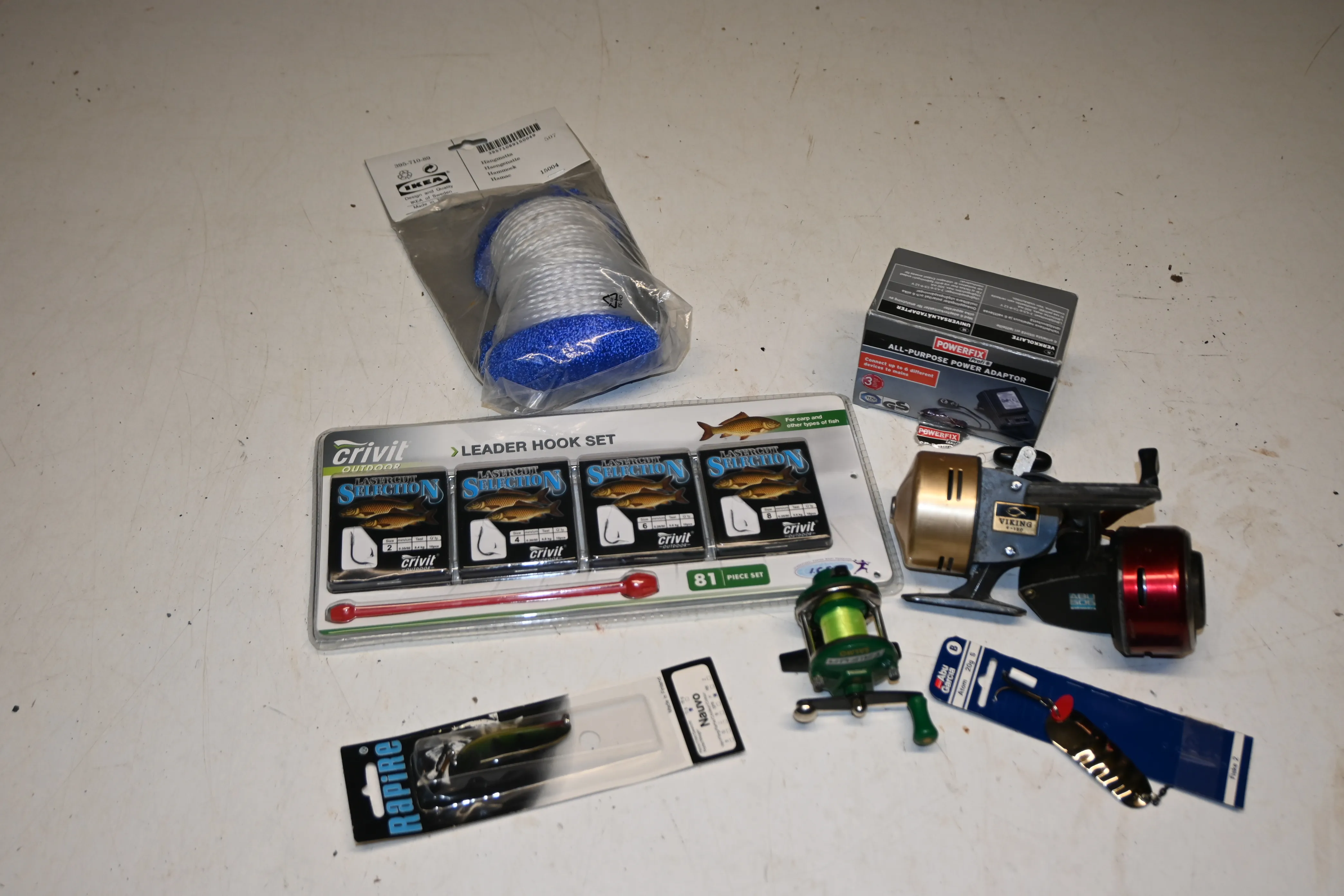 Parti fiskerullar bl a Viking, krokar, skedrag, hängmatta m.m