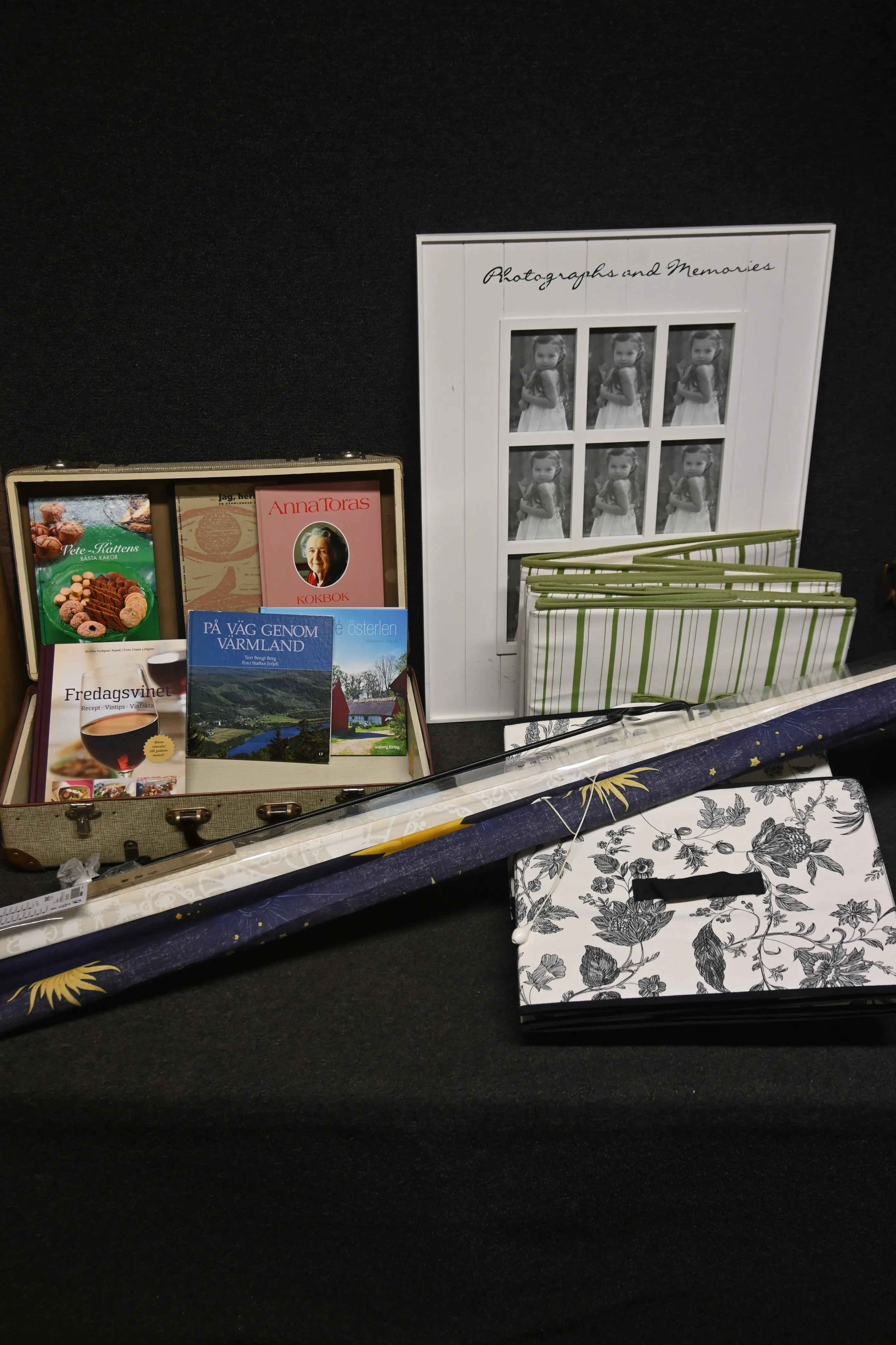 Parti fototavla, förvaringslådor i tyg 6st, böcker, rullgardiner 2st L.140 &160cm
