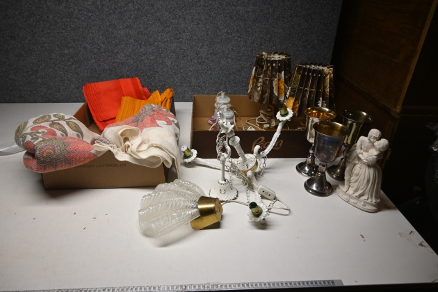 669. Parti gardiner retro, bordslampor, fönsterlampor, figu0rin, vägglampa (ngt nagg kan förekomma)