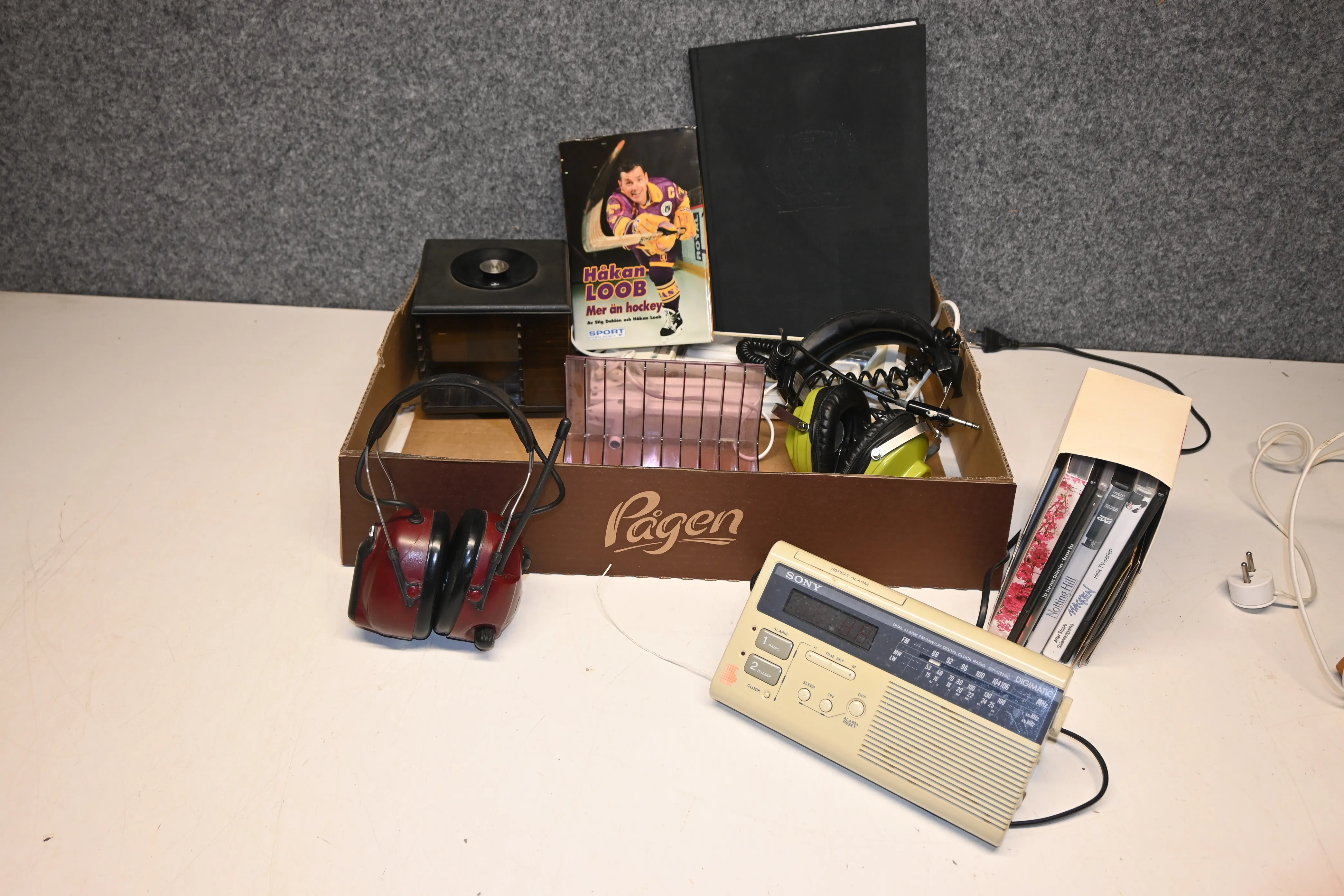 611. Parti hörselskydd "Peltor" , dvder, kassetsnurra, böcker Färjestad m.m