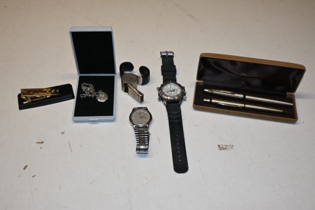 529. Parti halsband skogsstjärnan, slipsnålar, pennor, visselpipa, armbandsur bl a Citizen