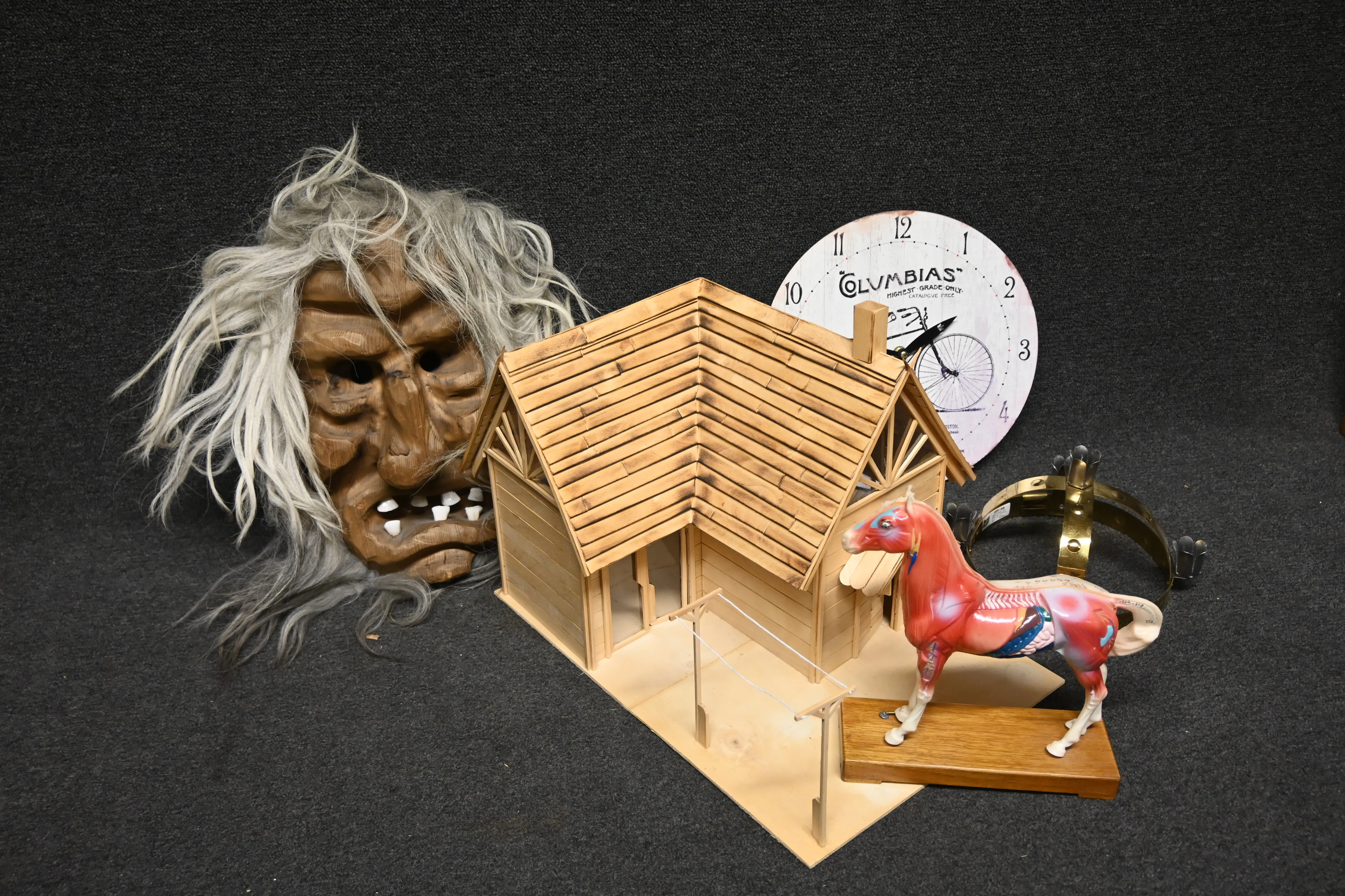 Parti handgjort hus H:28cm L.41cm, trämask, ljusstake, väggklocka, häst akupunktursmodell