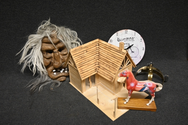 336. Parti handgjort hus H:28cm L.41cm, trämask, ljusstake, väggklocka, häst akupunktursmodell