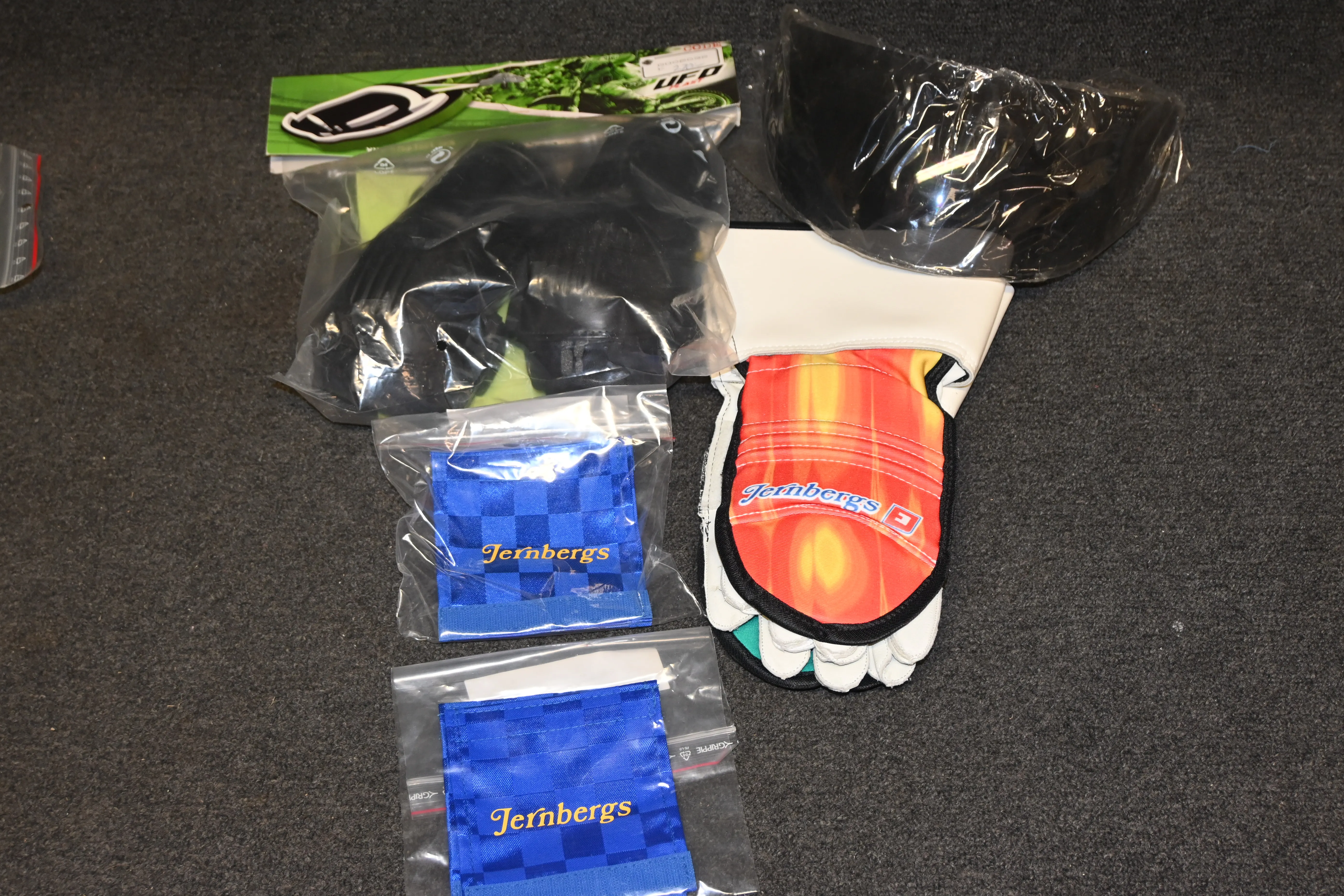 Parti handtagsskydd, mc-handskar, visir, armbågsskydd (oanvänt)