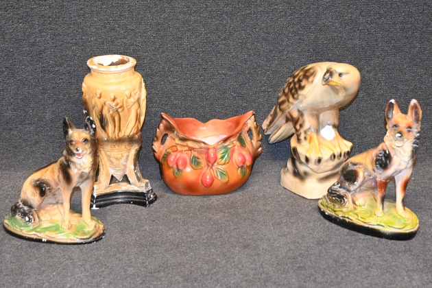 Parti jardinär figuriner ,vas i gips 1920-30 tal skador förekommer