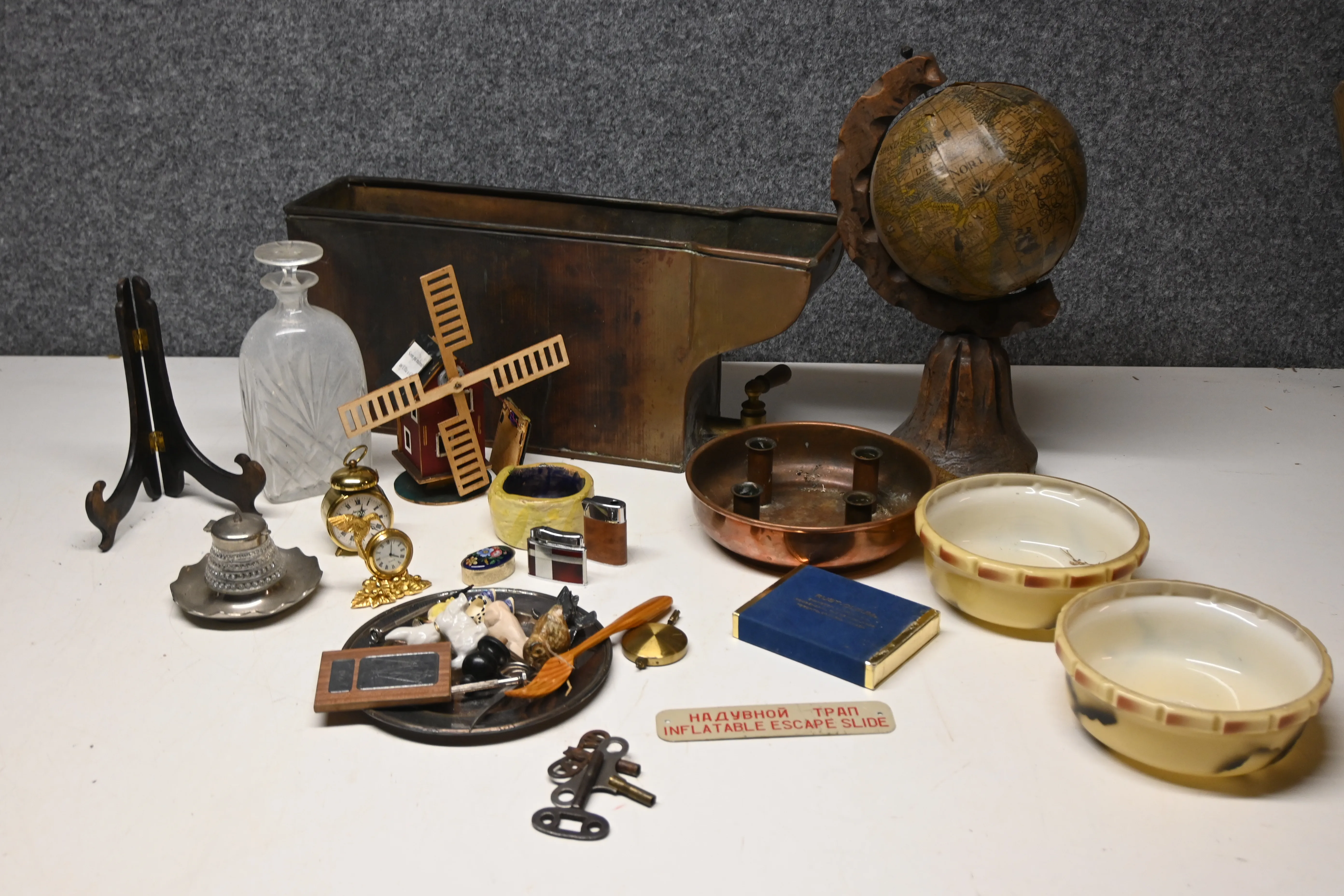Parti jordglob (slitage), karaff, lampkupor, tändare, klocknycklar m.m