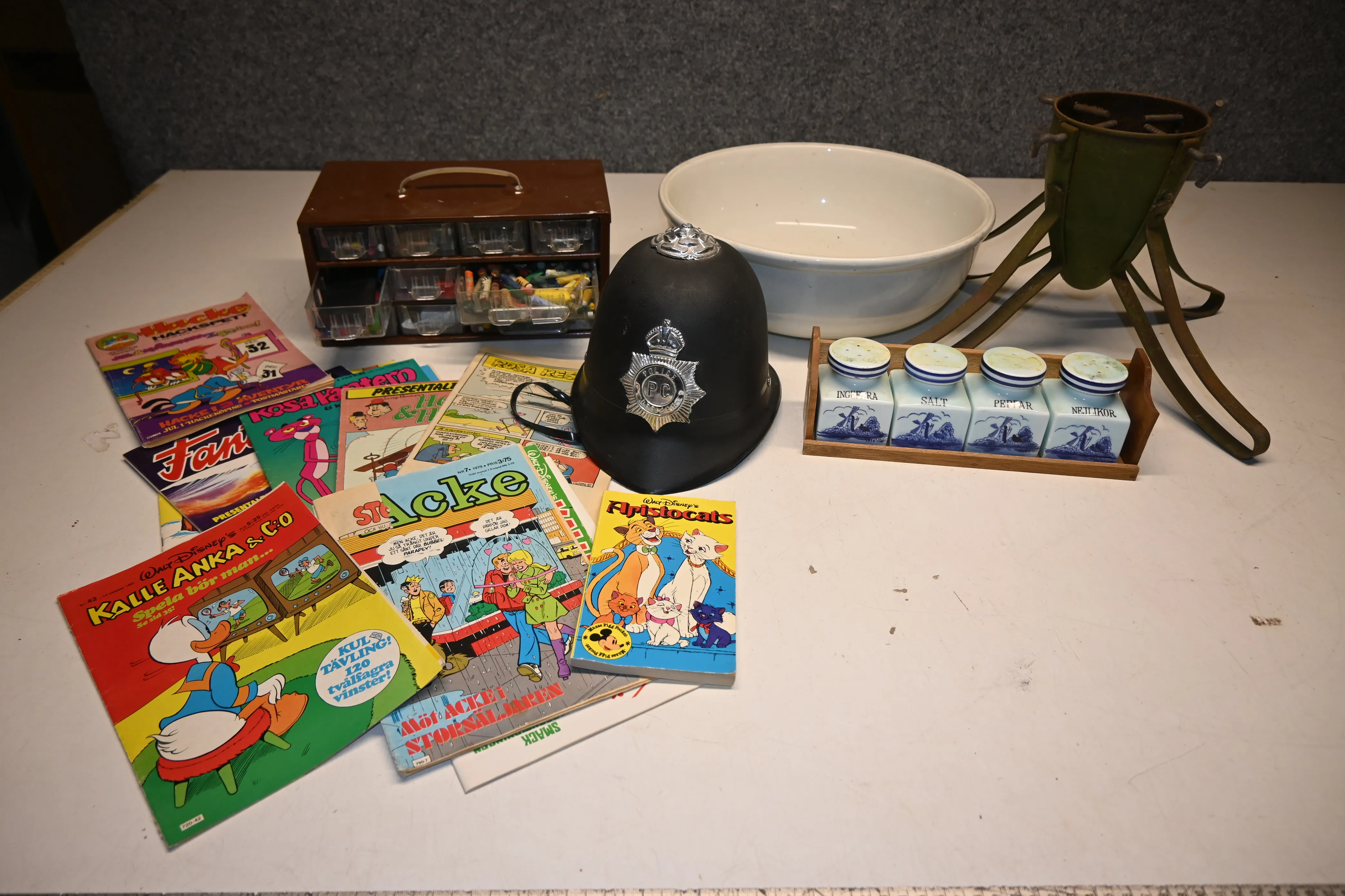 Parti julgransfot, tvättfat, kryddburkar, tidningar, polishjälm i plast (barn), sortimentlåda