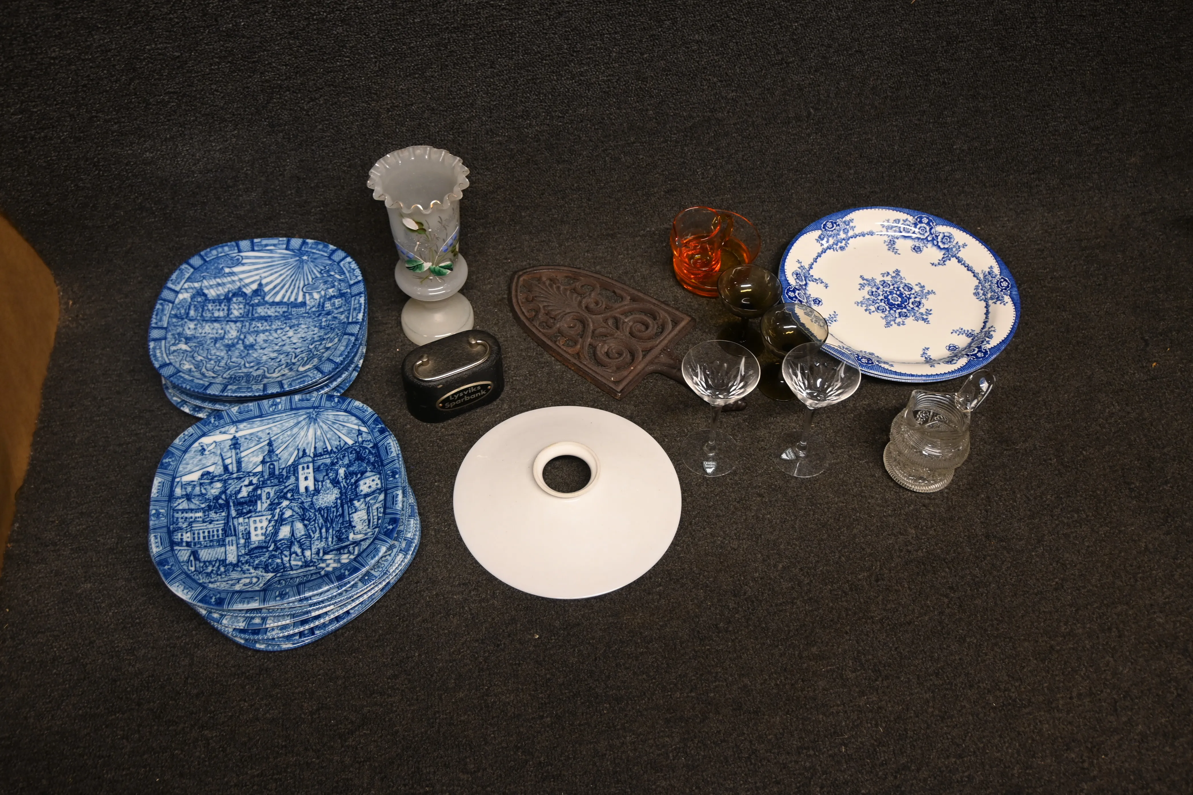 Parti jultallrikar, glas på fot bl a Orrefors, flussvas, skomakarskärm m.m