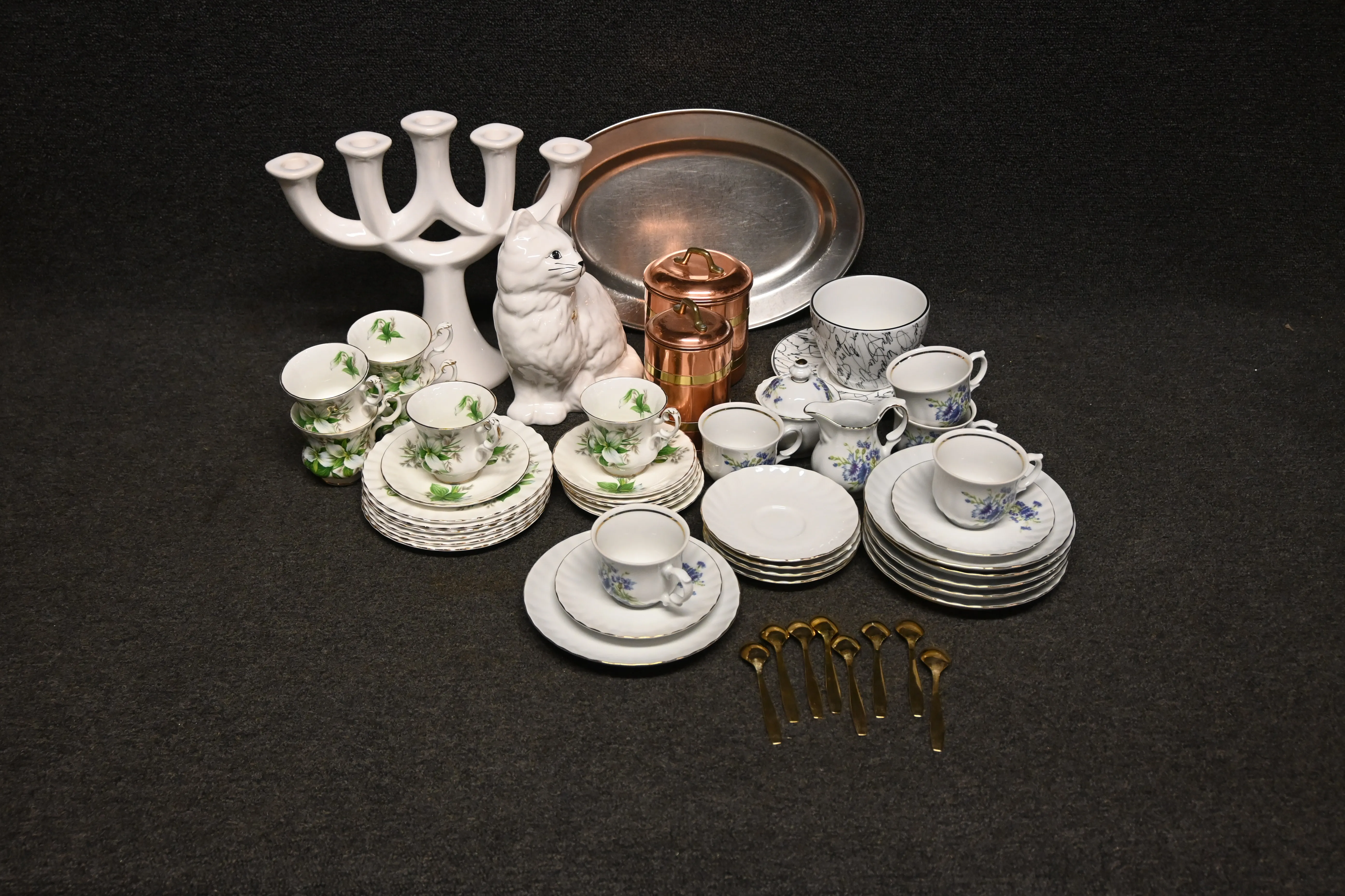 Parti kaffekoppar m fat, kattfigurin, bricka m.m