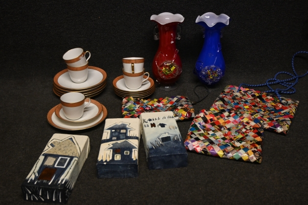 Parti kaffekoppar med fat "Brokad" Rörstrand, väggtavlor Susse Volander, vaser o konstglas, handväskor (Återburk)