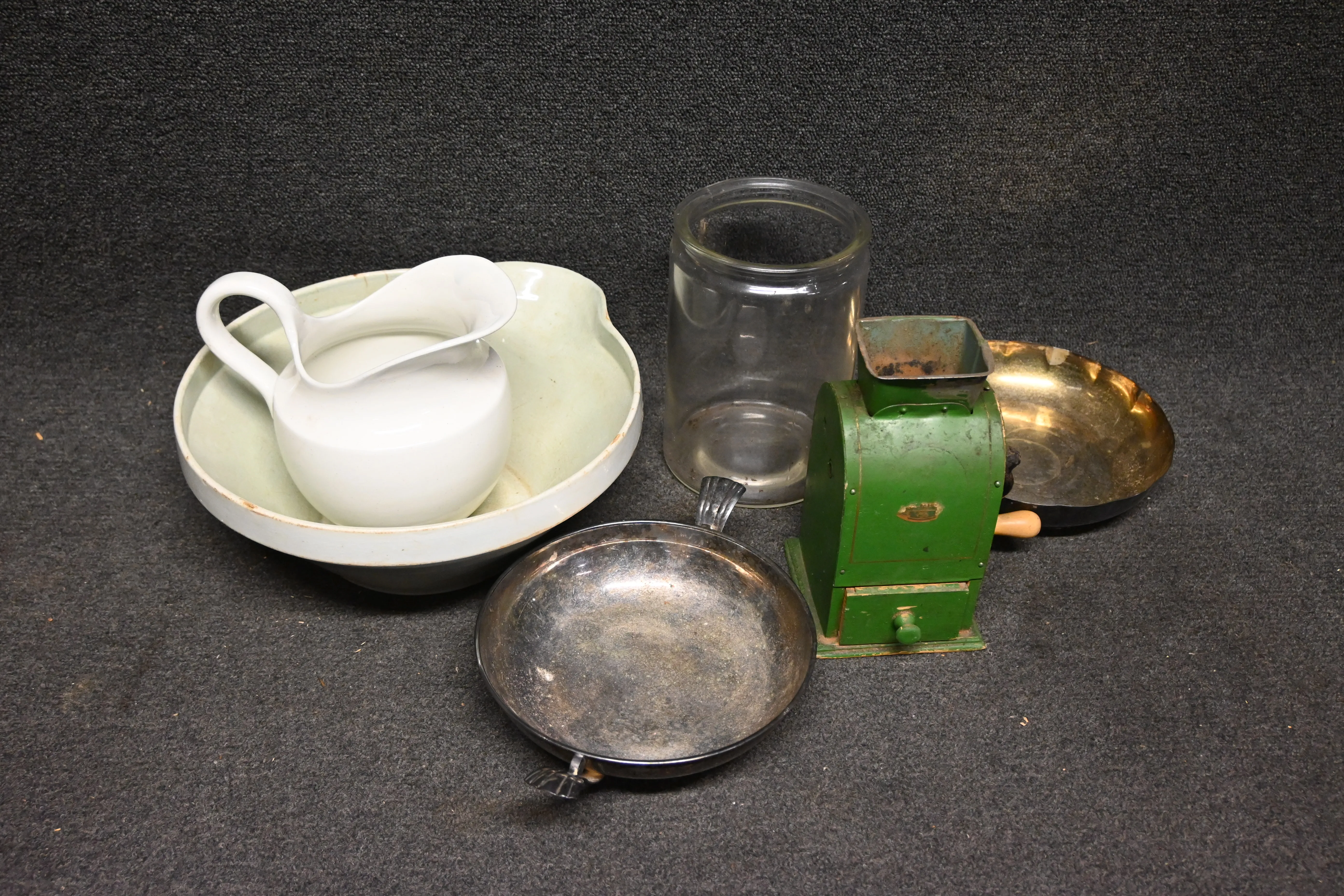 438. Parti kaffekvarn, spillkum, skål i ns, tvättkanna, förvaringsburk i glas