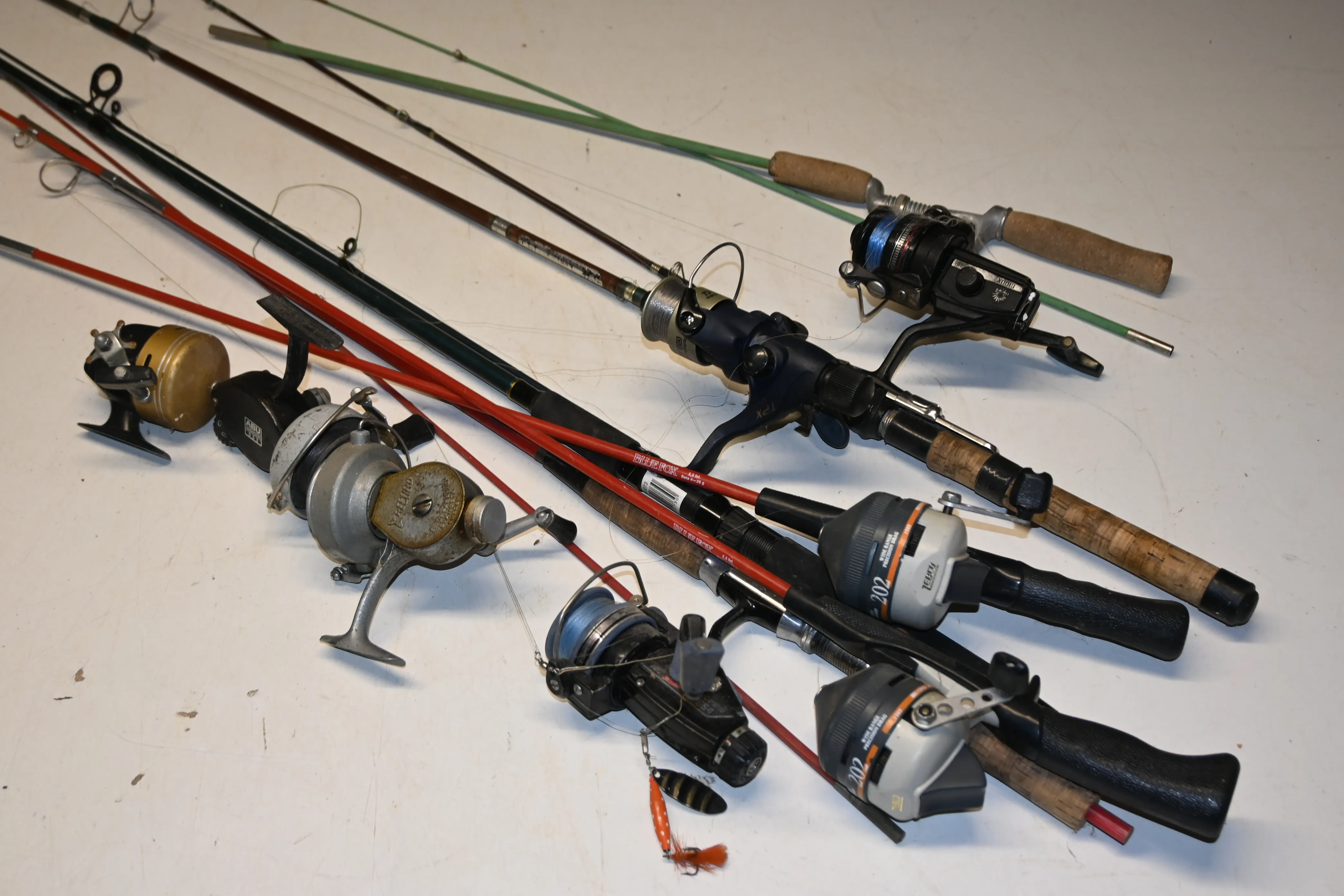 723. Parti kastspö m rullar bl a Daiwa, okuma, Abu Cardimal, äldre record (defekt i fäste)
