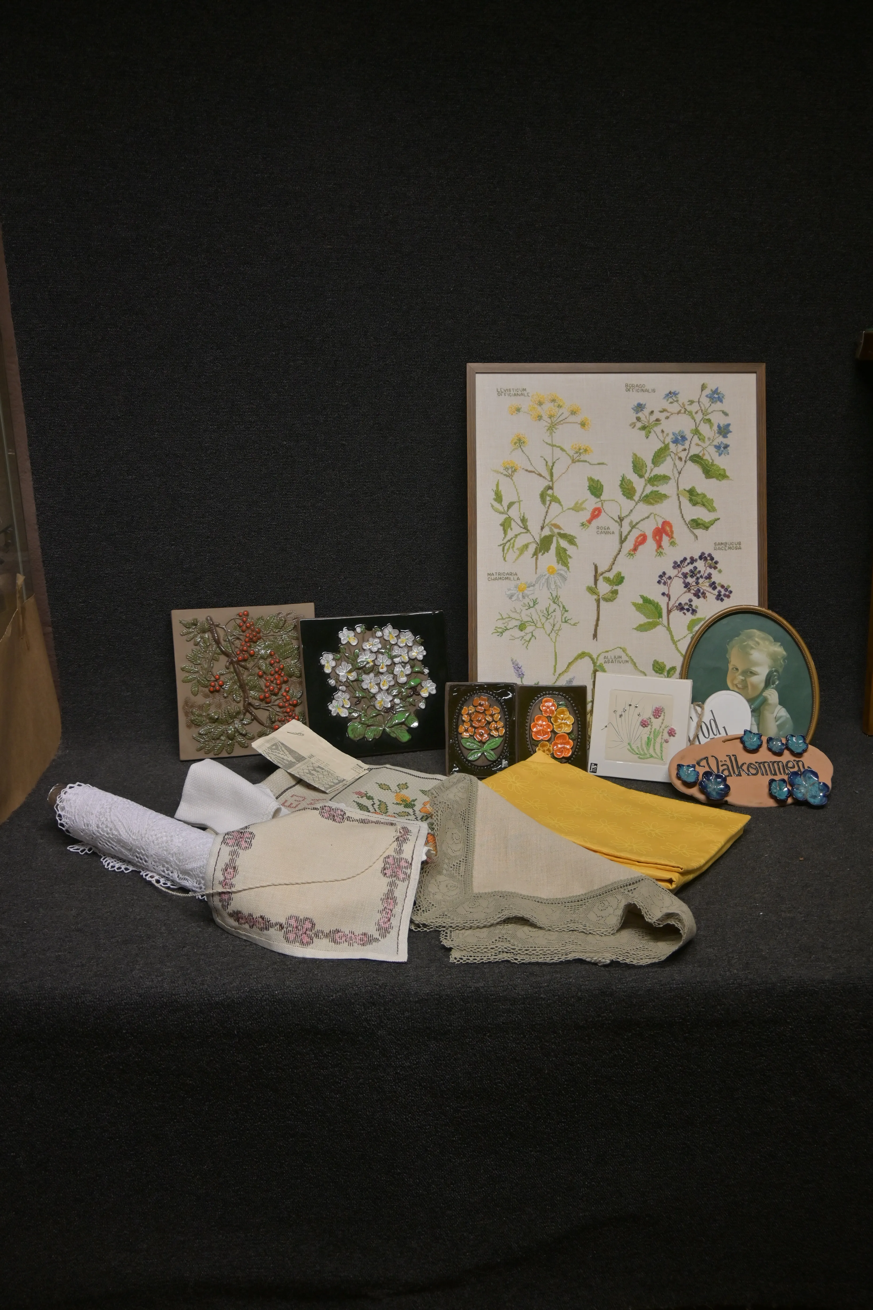 Parti keramik tavlor bl a Jie, broderad tavla m.m