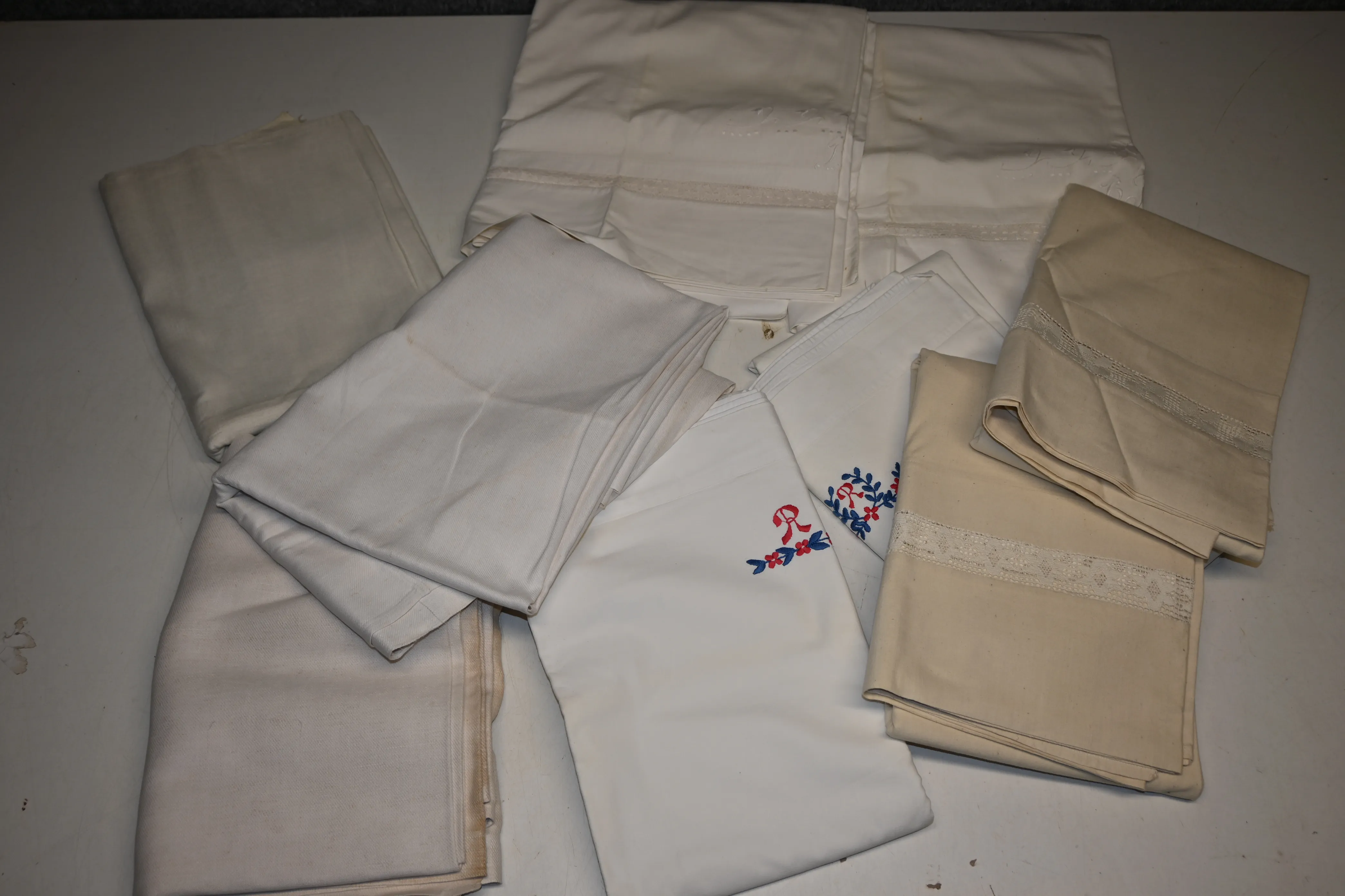 Parti lakan bl a hemvävda (missfärgning, fläckar förekommer)