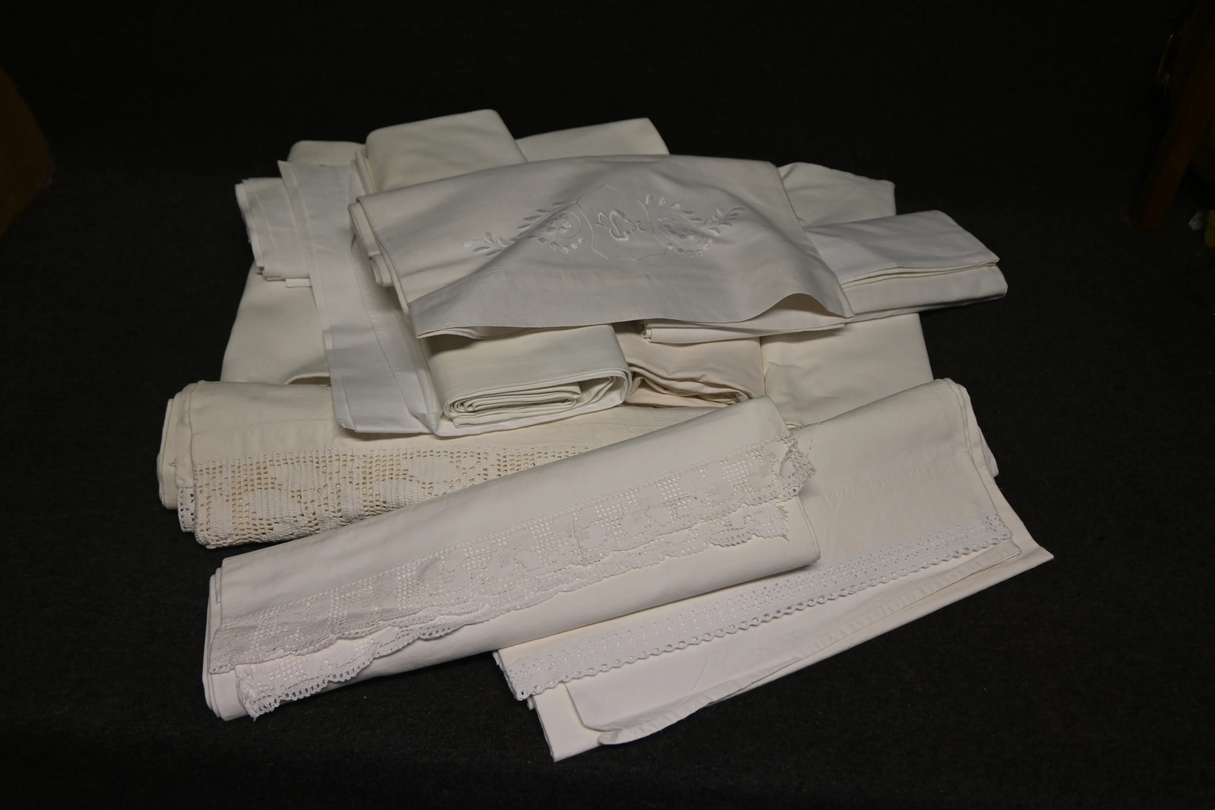 524. Parti Lakan med bl a broderi & spets, örngott