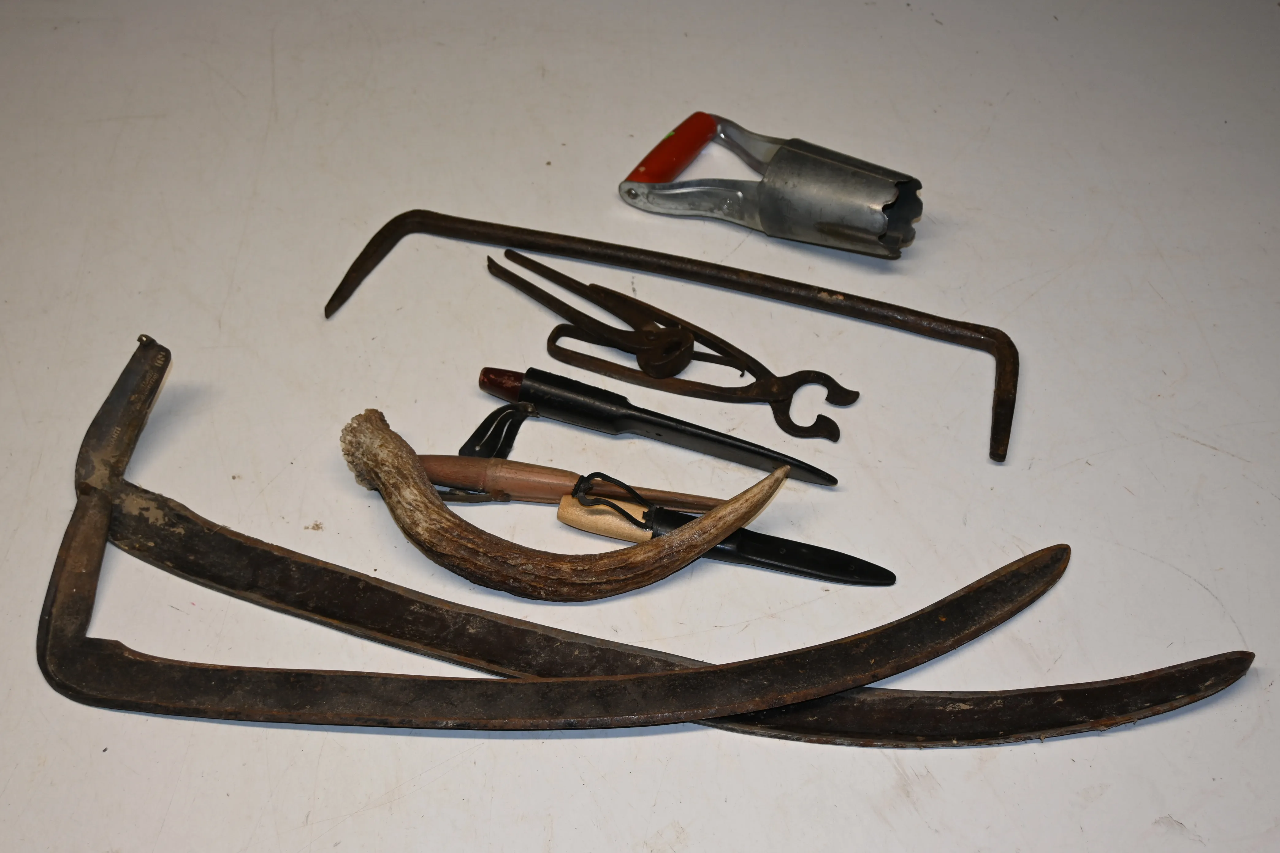 Parti lieblad, knivar bl a Mora, fällhorn,verktyg