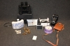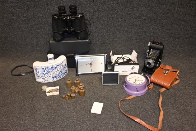Parti mässingvikter, pins, kikare (1 defekt glas), äldre bälgkamera, ringklockor, gps m.m