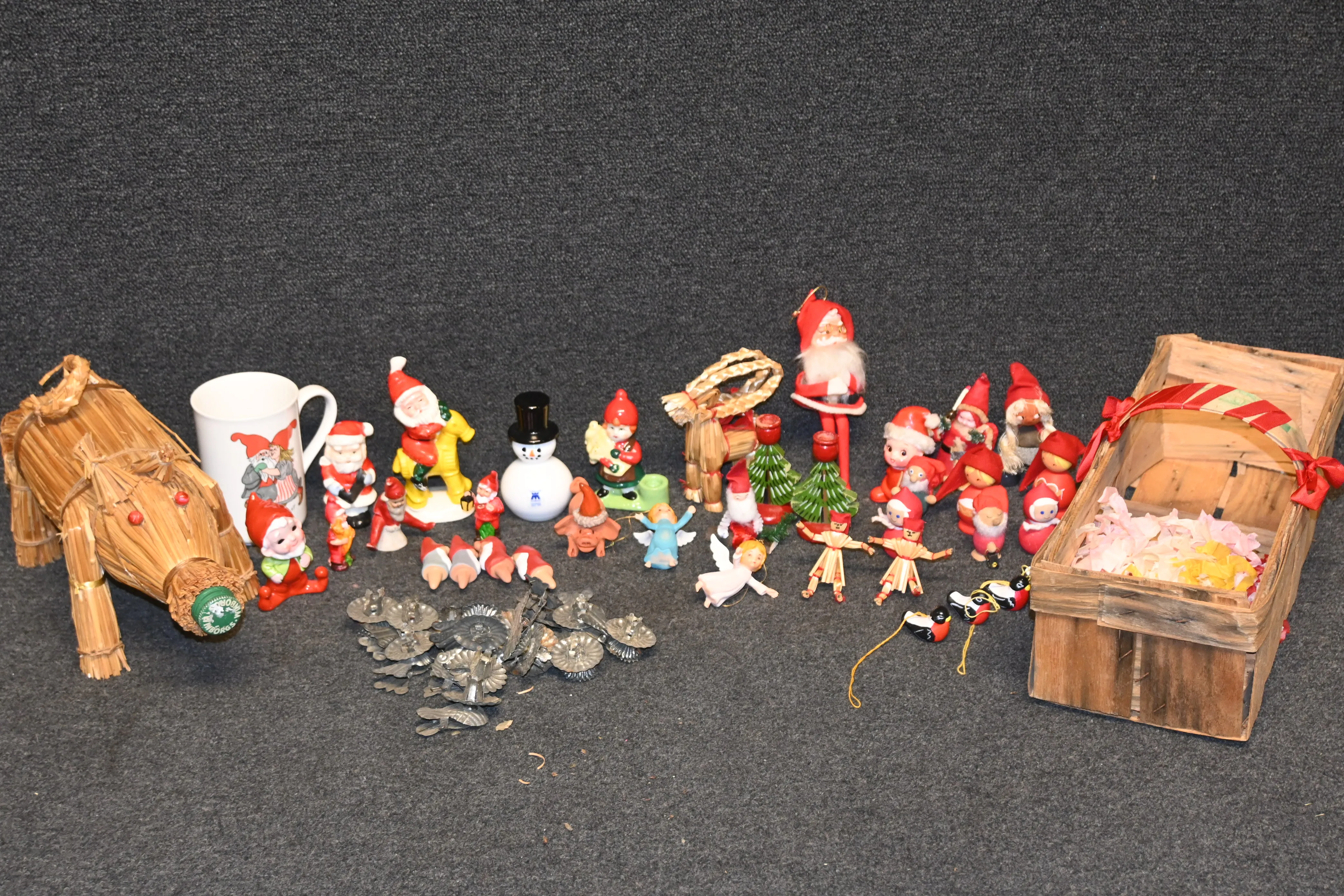 Parti miniatyrtomtar, fyllegris, julpynt, mugg Rolf Bergh m.m