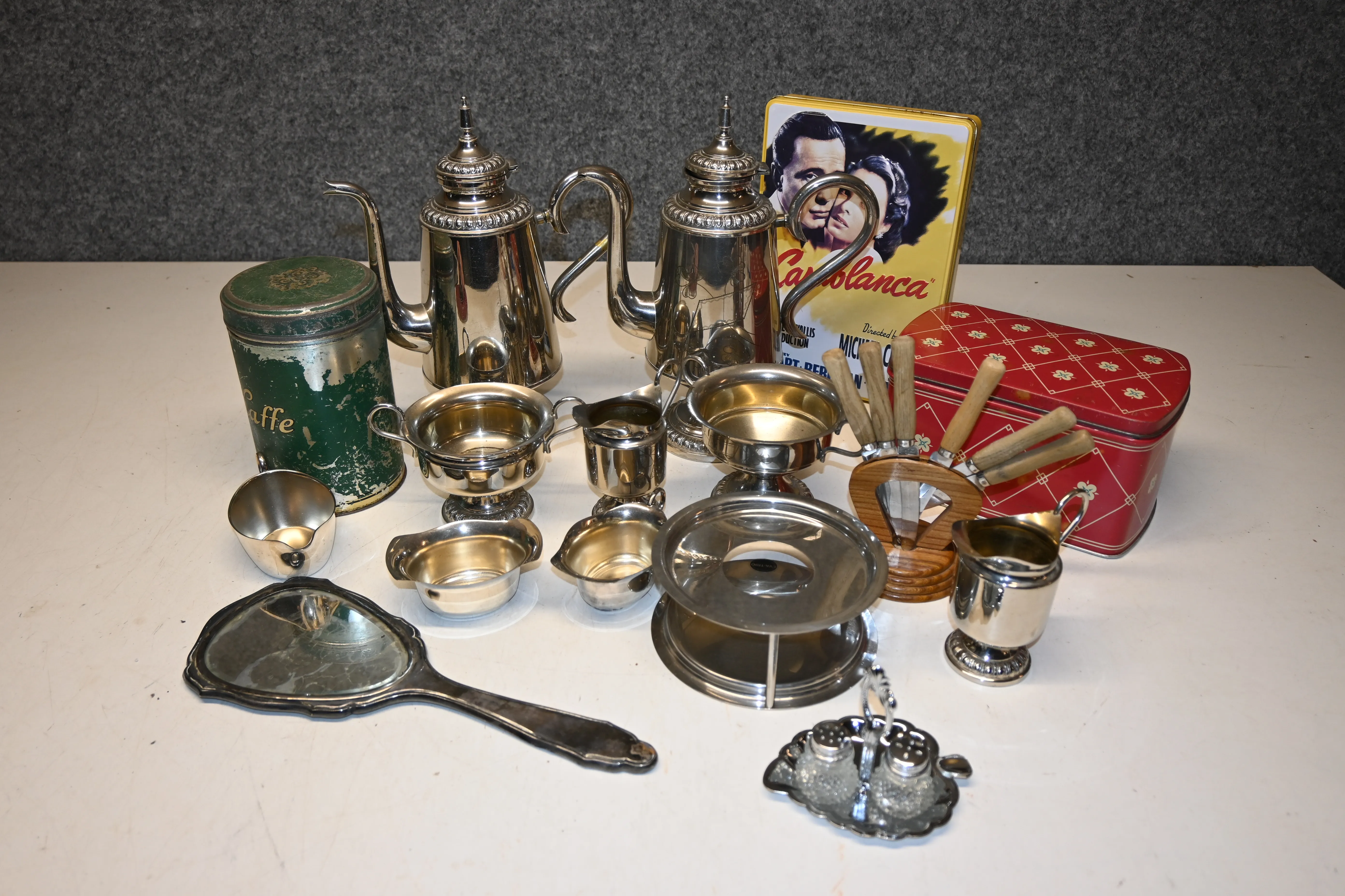 591. Parti nickelservis, plåtburkar, salt & peppar m.m