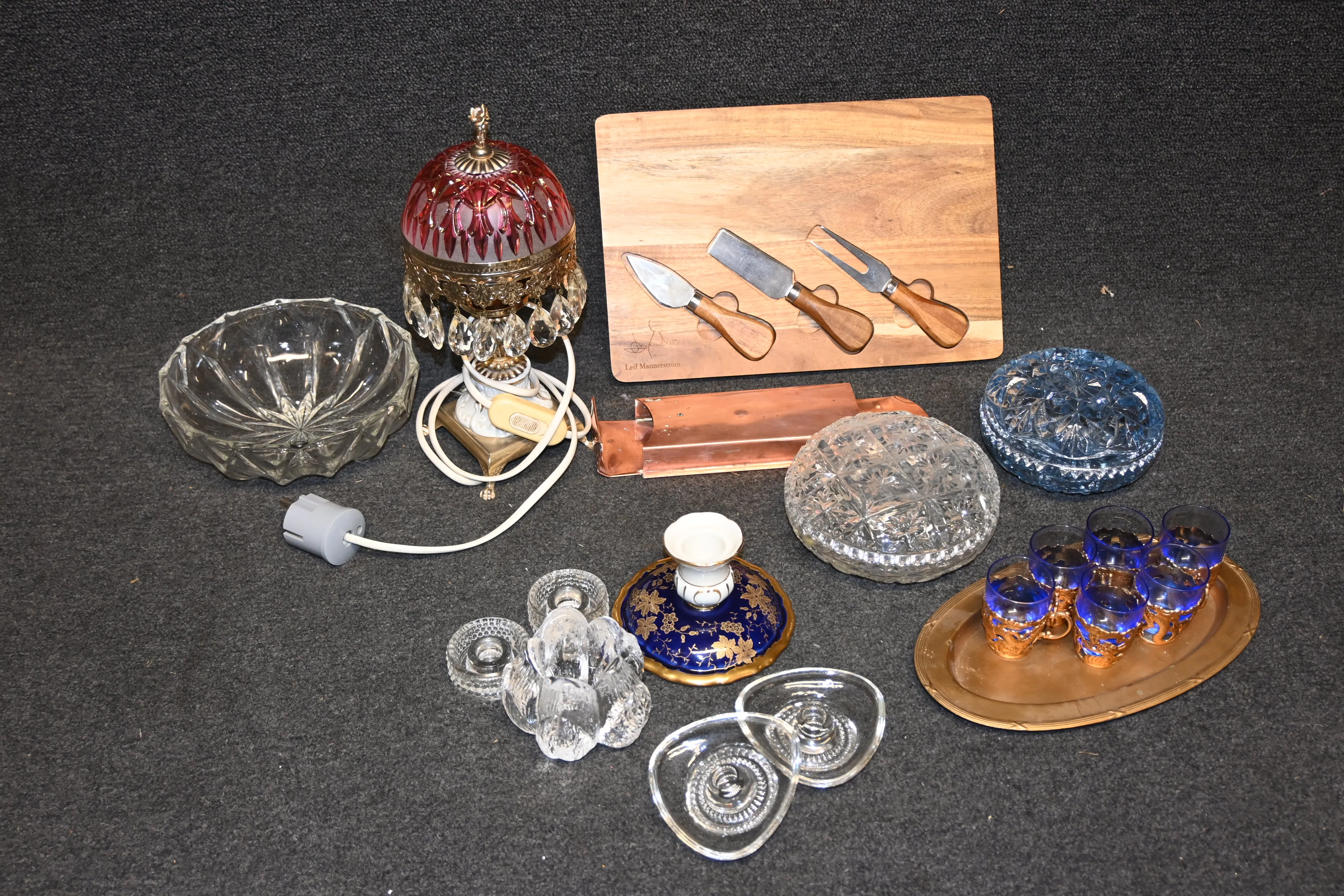 Parti ostbricka "Lief Mannerström", bordslampa, snapsglas, lockaskar i glas