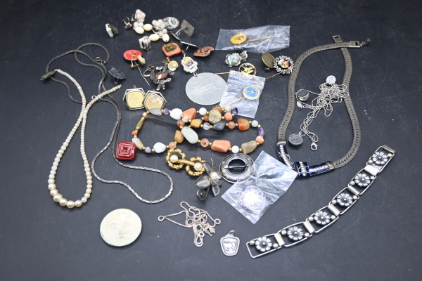 364. Parti pins, bijouterier bl a armband, hänge, halsband & Mynt 50kr 1976 i silver vikt.50.8gr