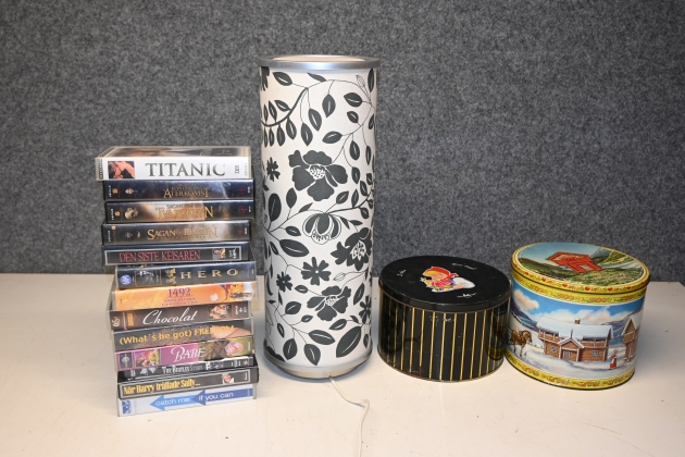 256. Parti plåtburkar, bordslampa med dimmer, vhs-filmer, dvd "The Beatles strory"