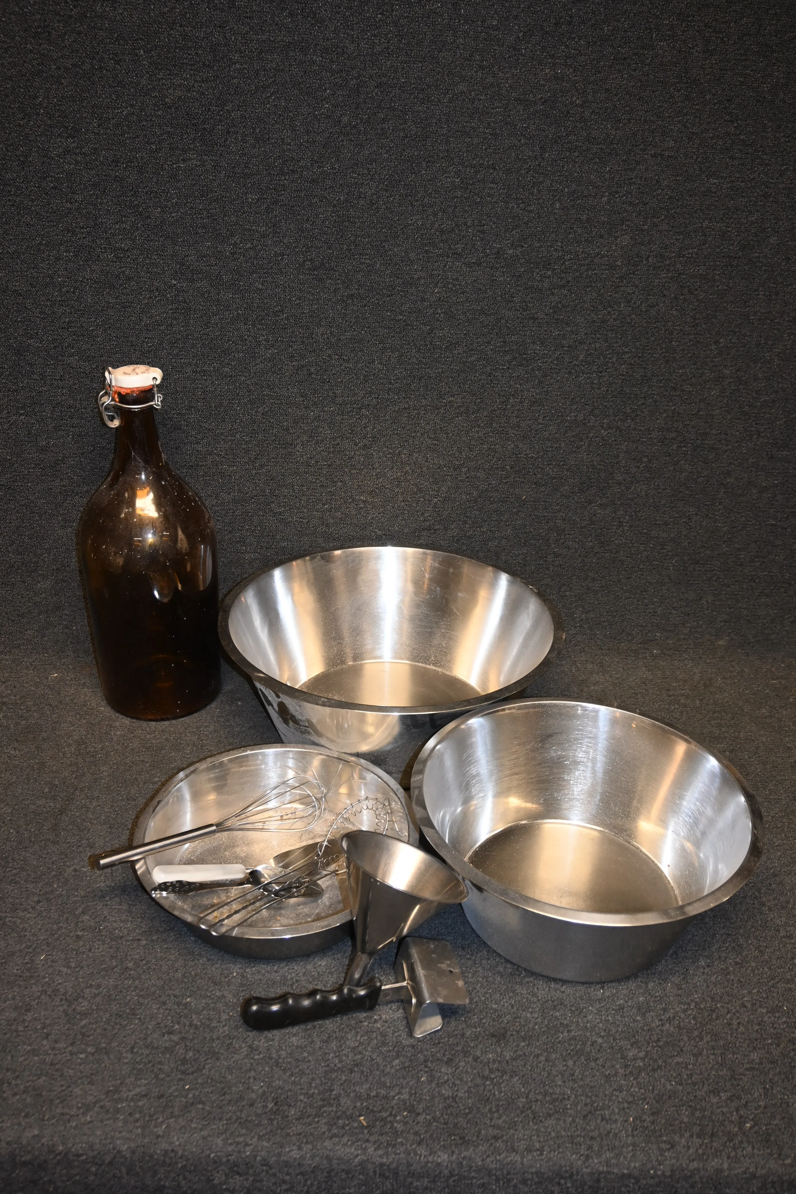 Parti rostfria bunkar bl a 8L & 14L, tratt, visp, svagdryckeskrus m.m