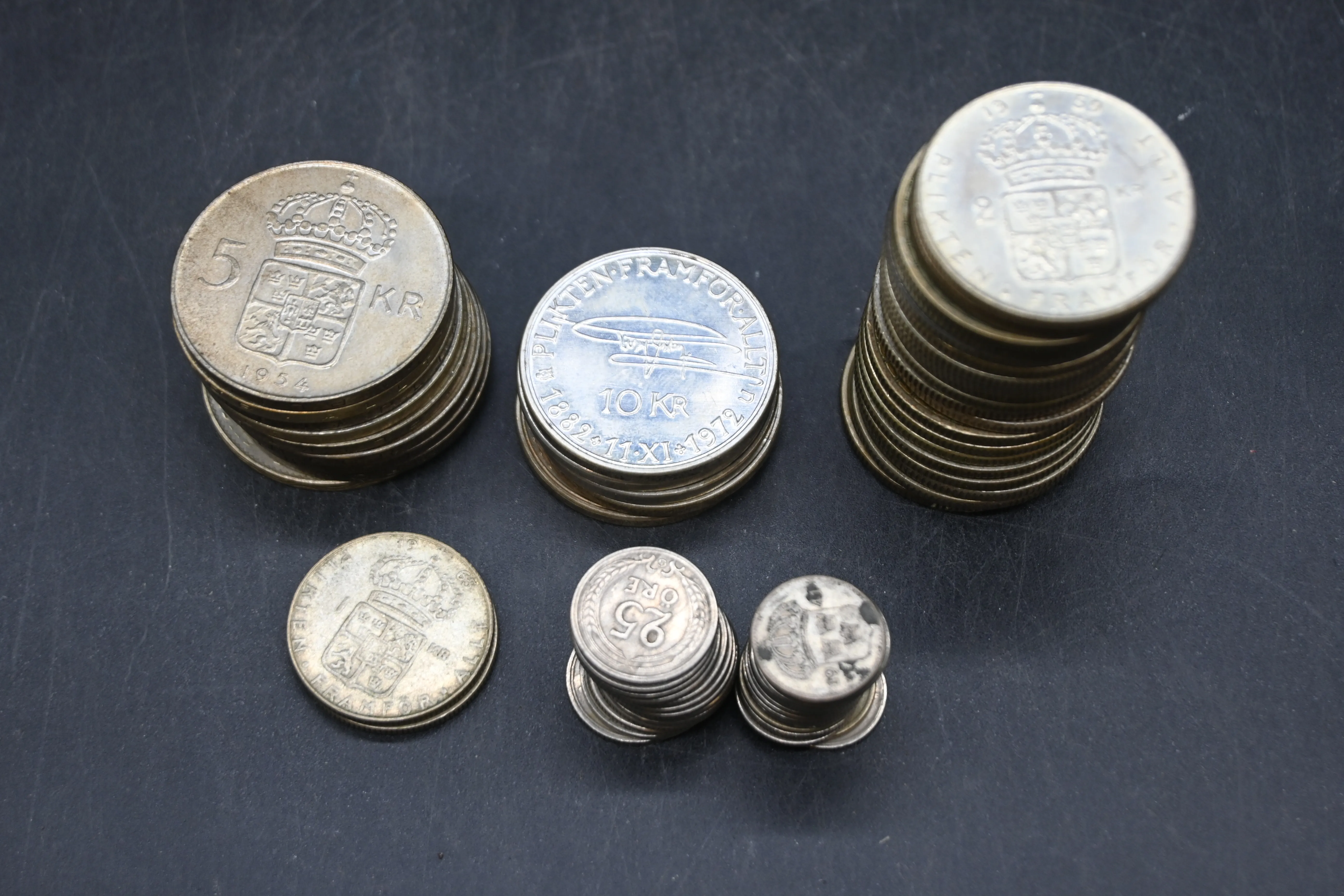 482. Parti silvermynt 10-kronor 1972, 2-kroner 1938-64, 5-kroner 1954-59. 1-kroner 2st, 25öre 1921-46, 10öre 1921-62. Vikt. 622gr