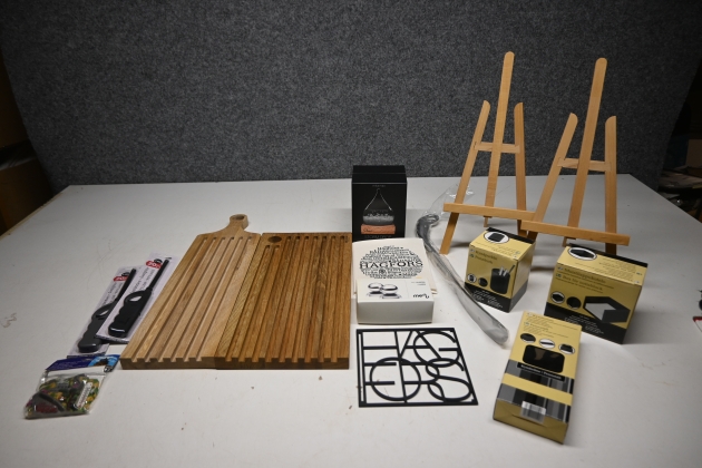 146. Parti skärbräda, bok/tavelstöd, pennburkar, underlägg/disktrasor (Hagfors) m.m