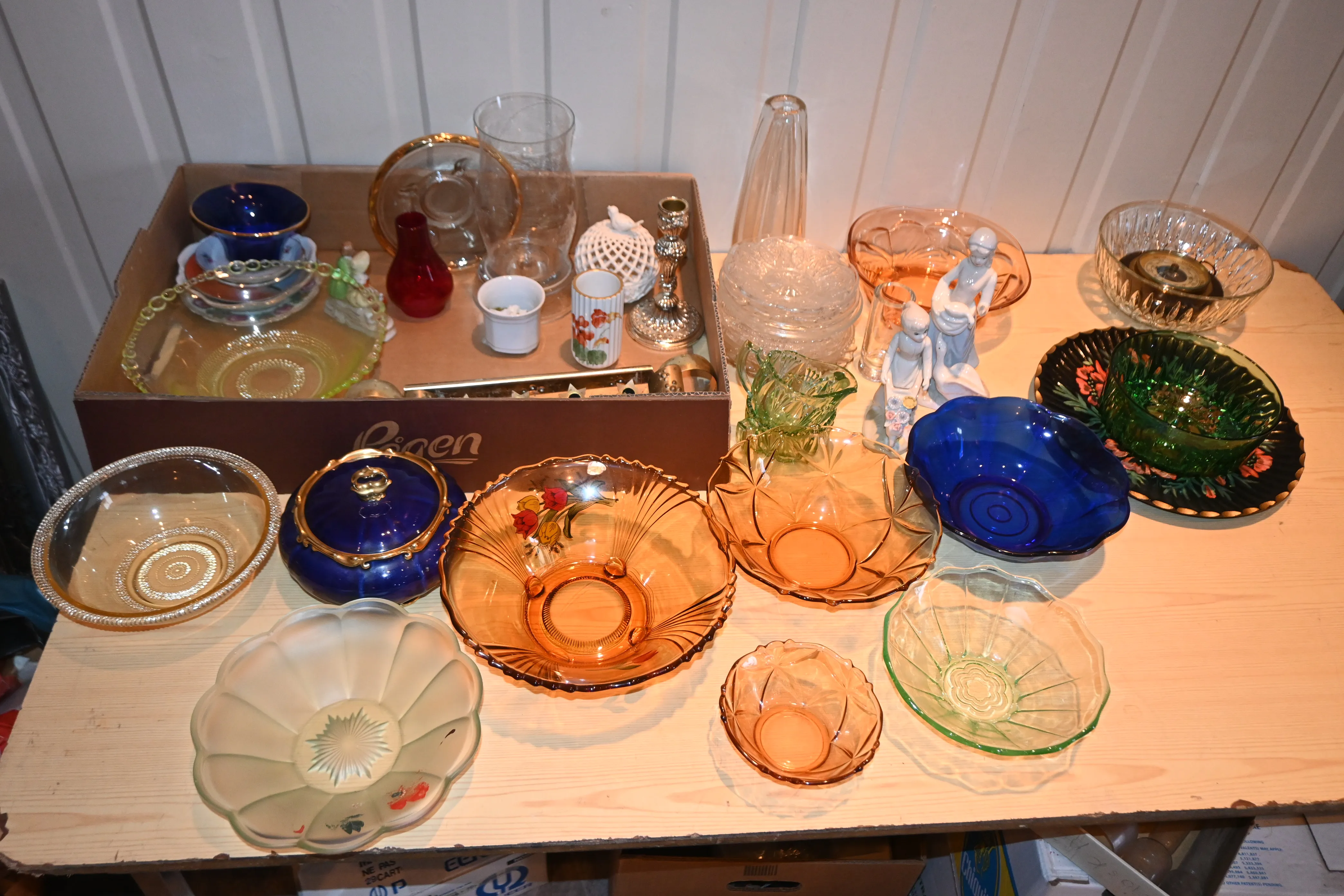 146. Parti saltkar, assietter, ljusstakar vas mestadels pressglas m.m