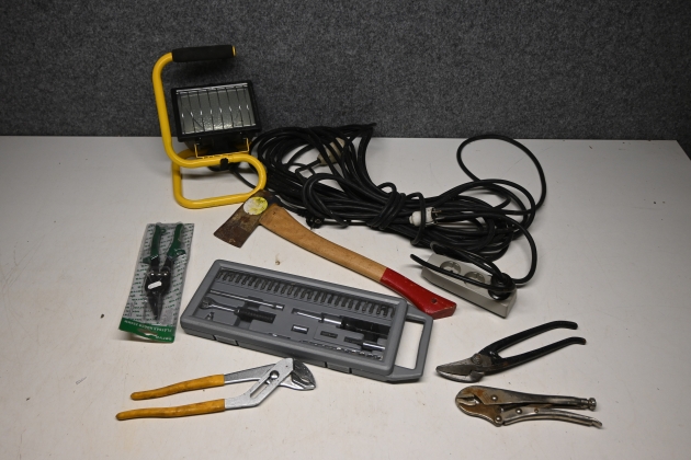 Parti skarvsladd, bygglampa (lampa bör bytas), verktyg