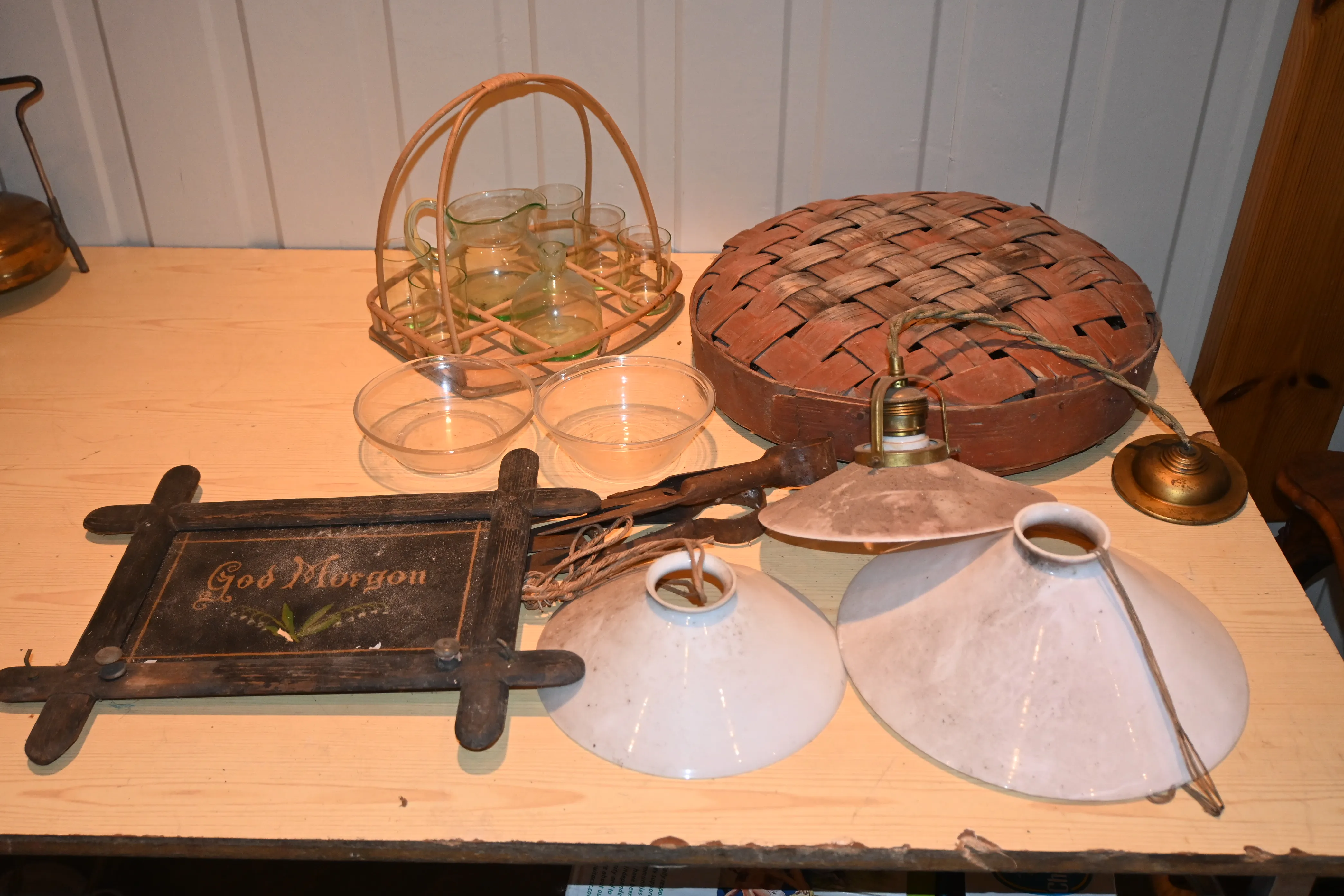 Parti skomakarlampor, såll, saftservis (1 glas saknas), godmorgon spegel m.m