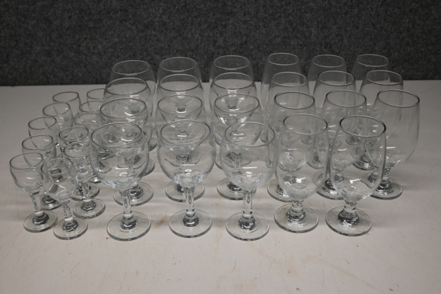 142. Parti snapsglas 12st, vinglas 12st, ölglas 11st