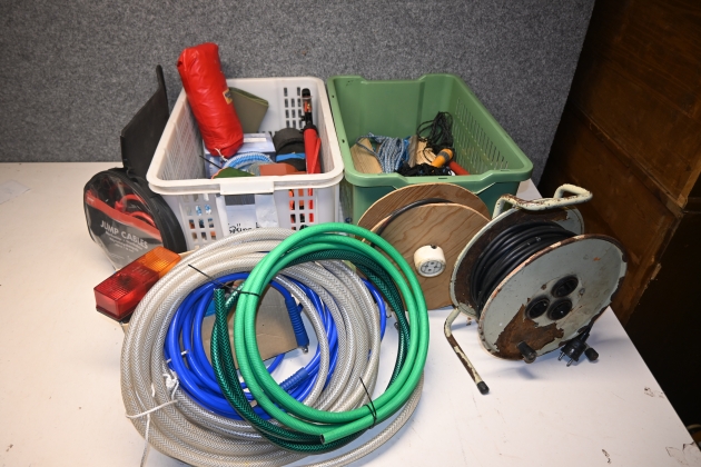 Parti startkablar, spännband, vattenslangar, kabelvindor m.m