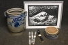 3. Parti syltkruka, litografi av Bengt Göran Flod, Damarmbandsur, Burk i keramik UE av Ingrid Atterberg